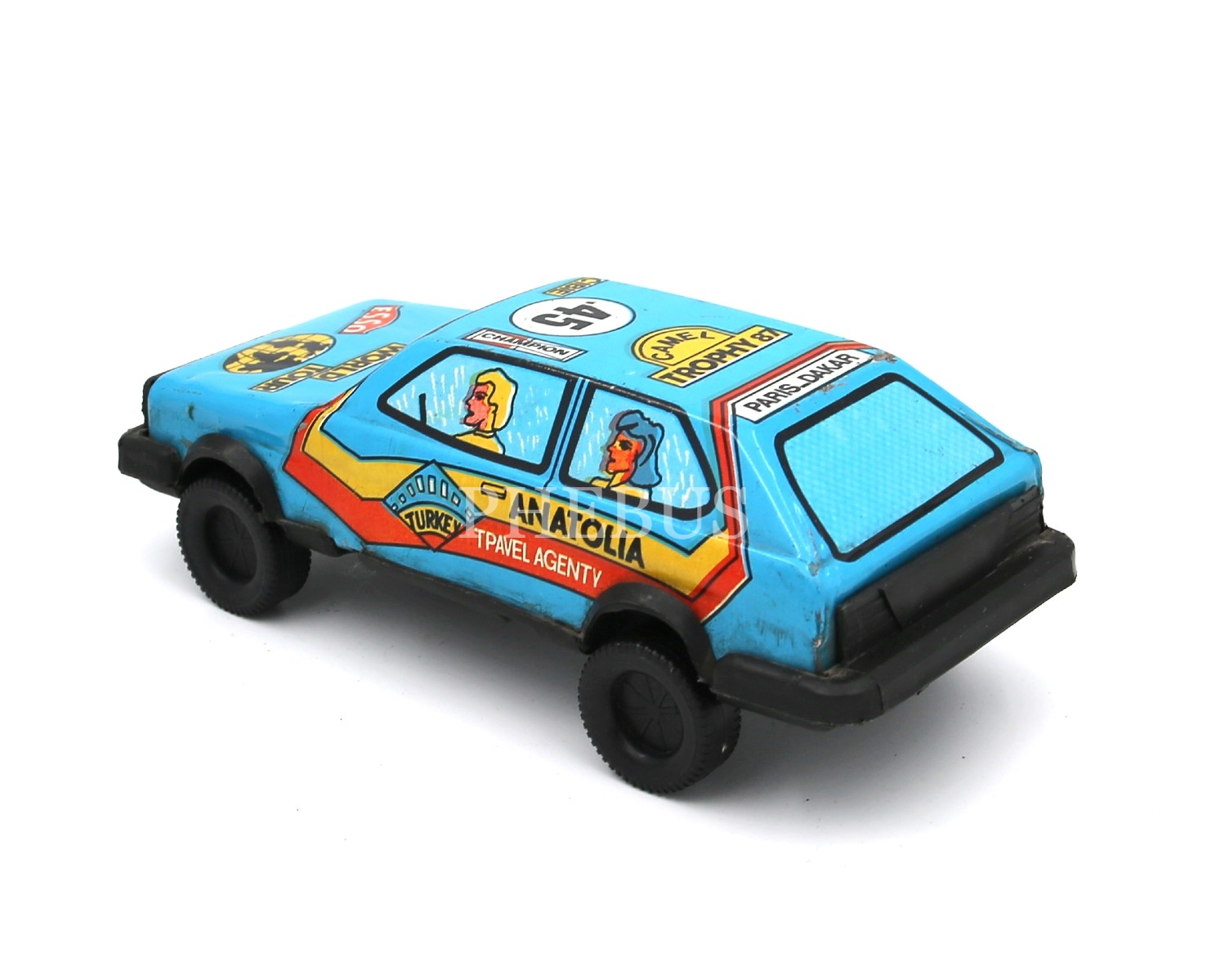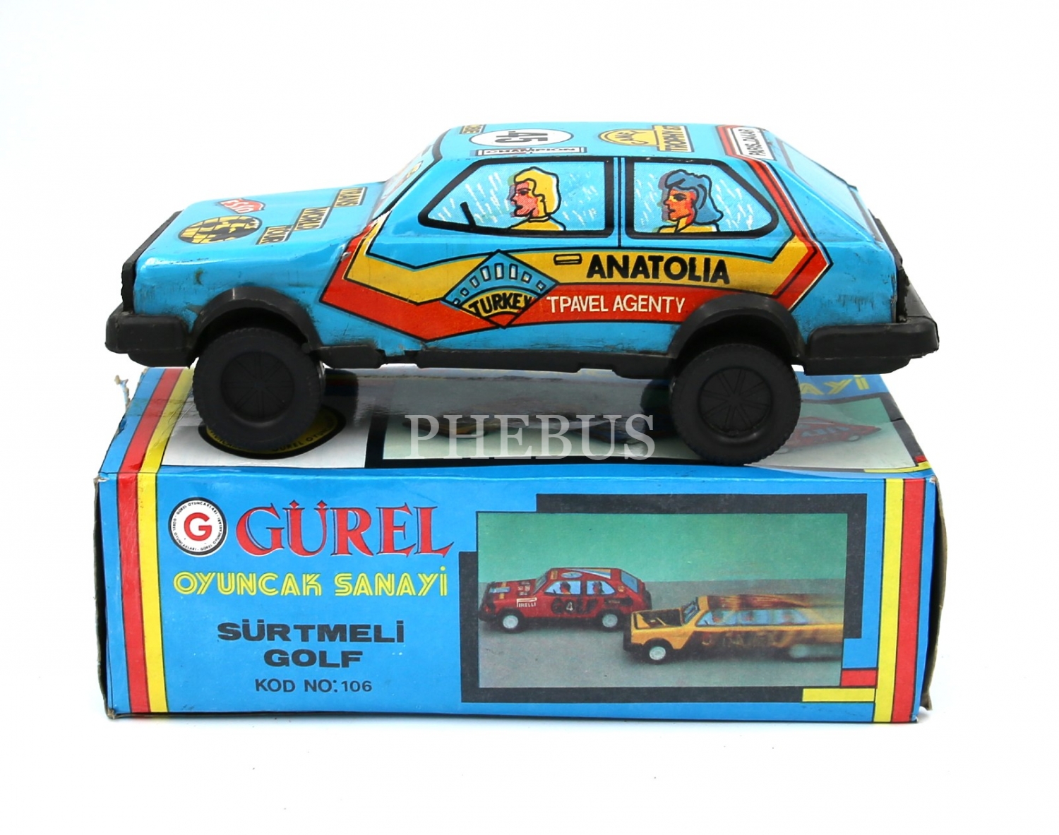 Türk malı, Gürel marka, orijinal kutusunda sürtmeli Golf teneke oyuncak araba, 21x10x8 cm