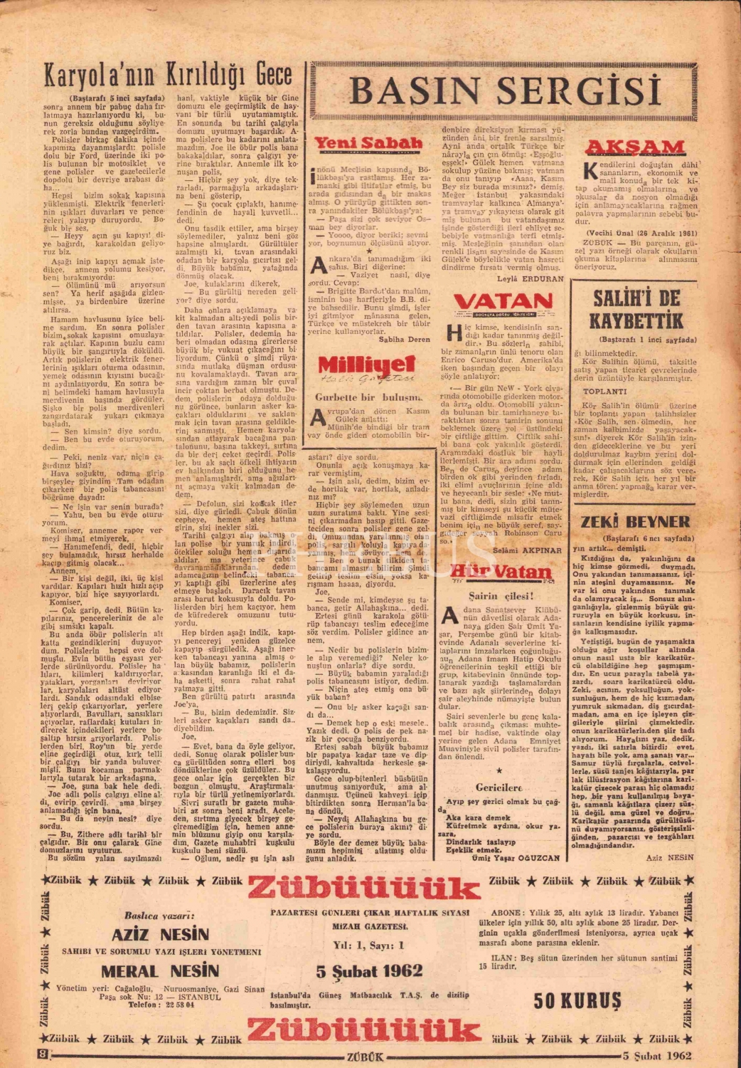 Aziz Nesin'in çıkardığı mizahi gazete: Zübük - Sayı 1 - No: 1, 5 Şubat 1962, 8 sayfa, 42x29 cm