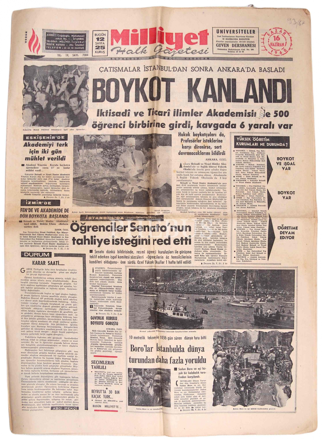 'Çatışmalar İstanbul'dan Sonra Ankara'da Başladı - Boykot Kanlandı'' manşetli Milliyet Halk Gazetesi, 16 Haziran 1968, 8 sayfa, 59x42 cm