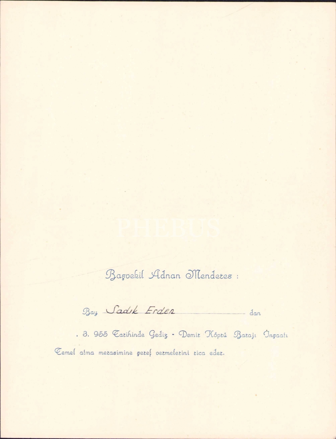 Başvekil Adnan Menderes adına yollanmış 1955 tarihinde Gediz - Demir Köprü Barajı İnşaatı Temel Atma Töreni davetiyesi, 17x11 cm