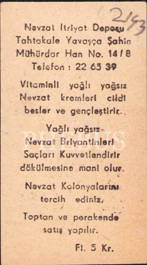 Nevzat Briyantinleri Kremleri Kolonyoları reklam kartı, 8x4 cm