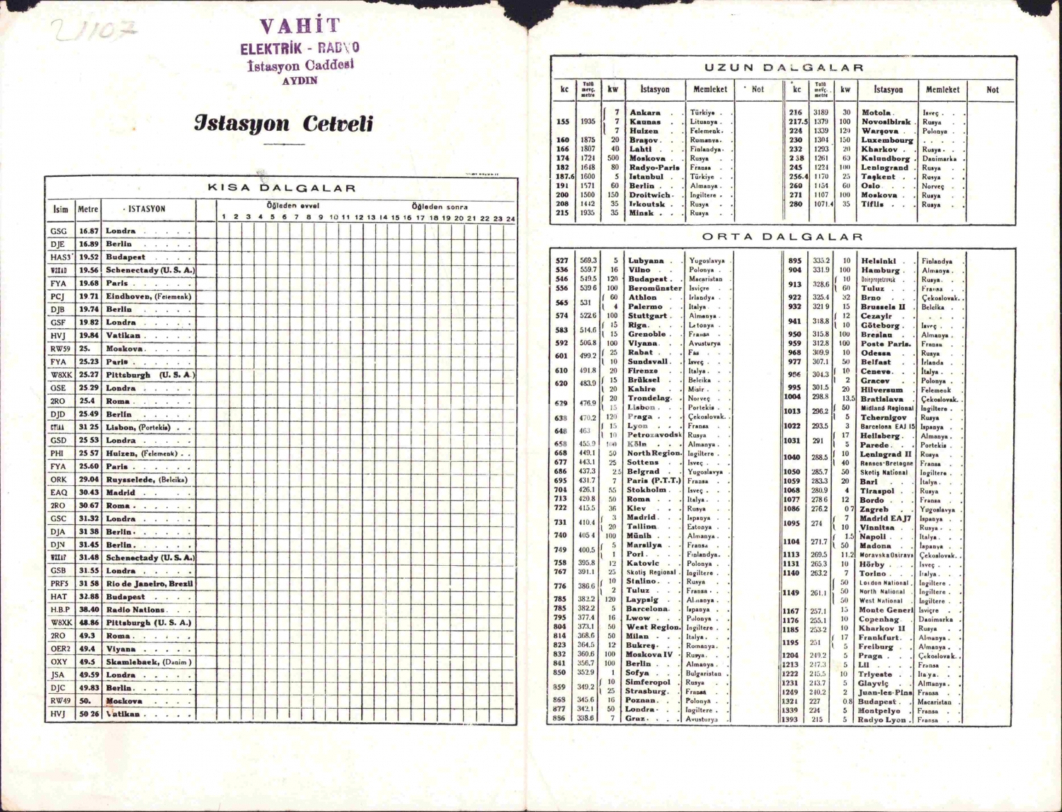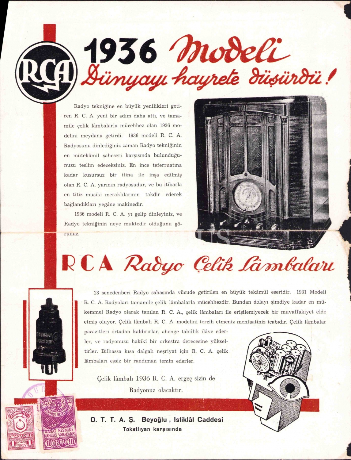 RCA Radyoları 1936 tarihli broşür, içi İstasyon Cetveli, Vahit Elektrik - Radyo İstasyon Caddesi Aydın damgalı, pullu damgalı, postadan geçmiş, 30x24 cm