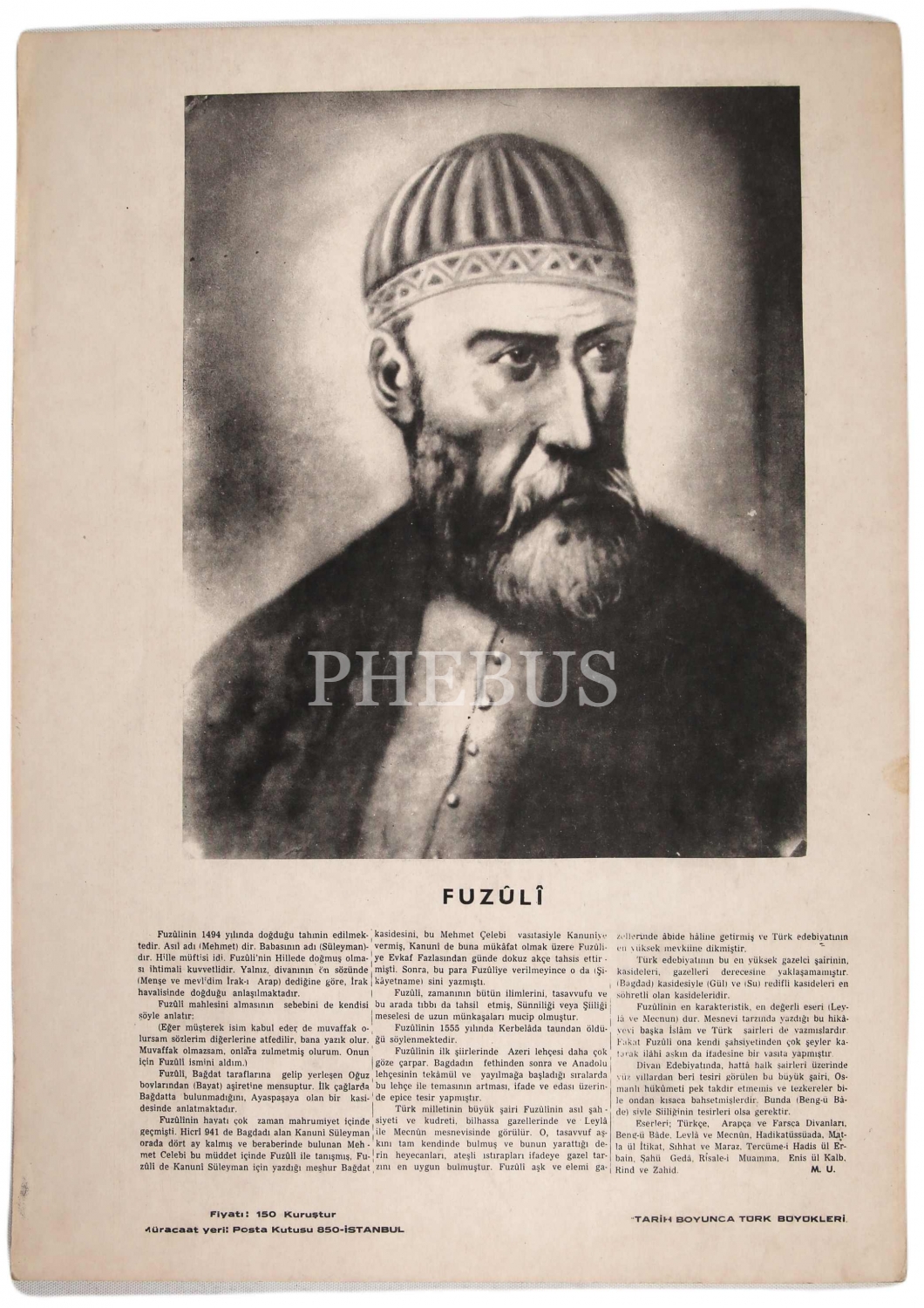 Tarih Boyunca Türk Büyükleri: Fuzuli afiş, İstanbul baskı, 33x48 cm