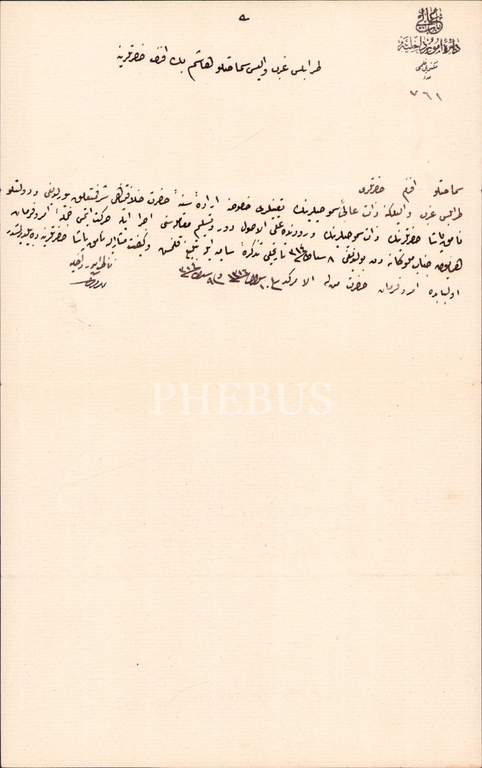 1304 tarihinde Umur-ı Dahiliye Nazırından Trablusgarp Valisi Haşim Beyefendi'ye "Emirname", 19x30 cm