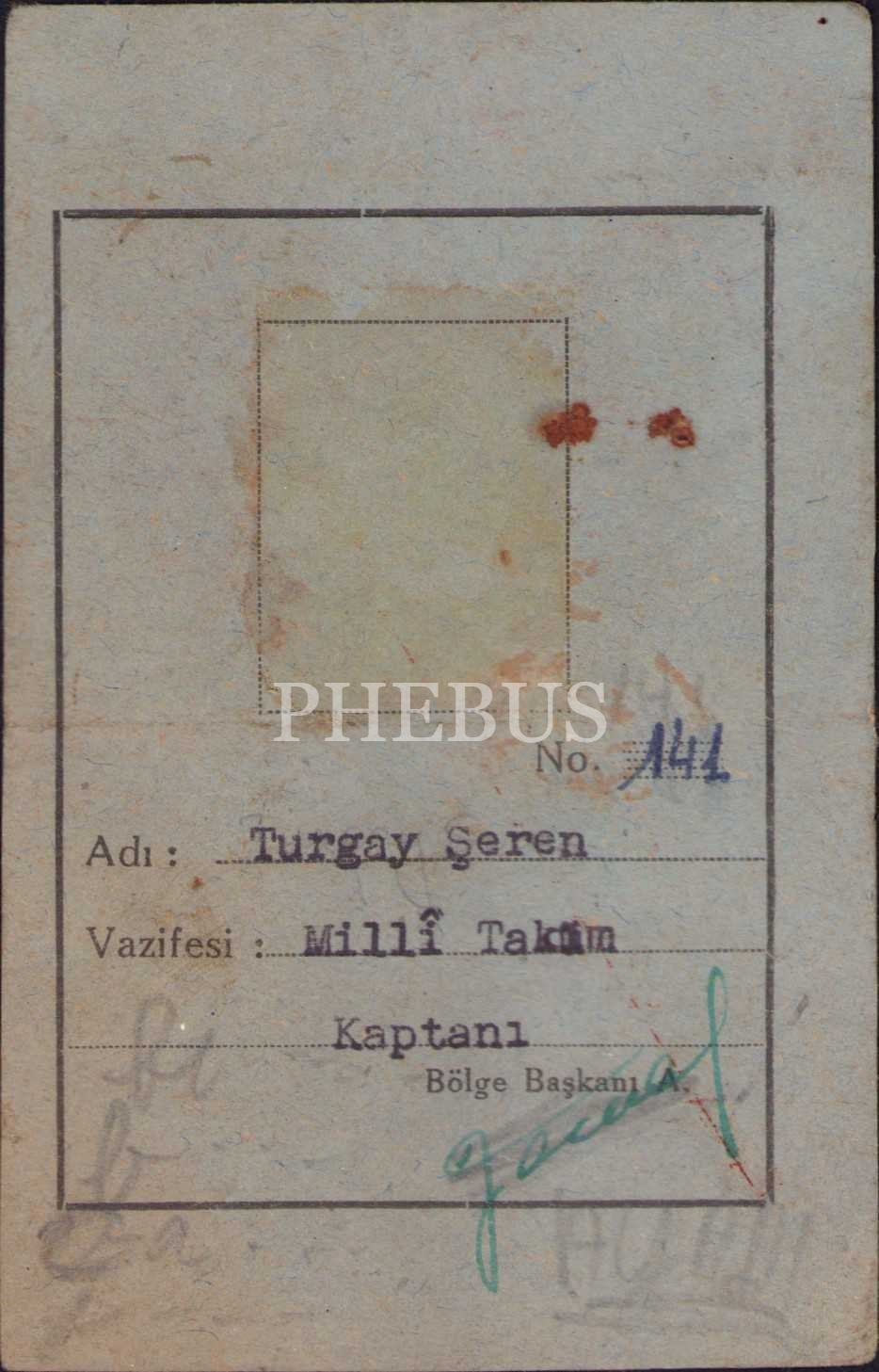 Turgay Şeren'e ait Milli Takım kaptanlık kartı, 8x11 cm