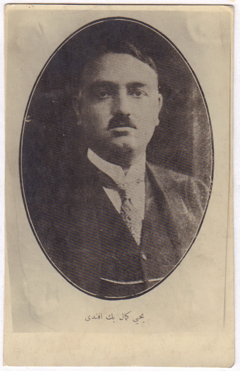 Portre üzerinde Osmanlıca "Yahya Kemal Bey Efendi" yazılı. Ebat: 14x9 cm