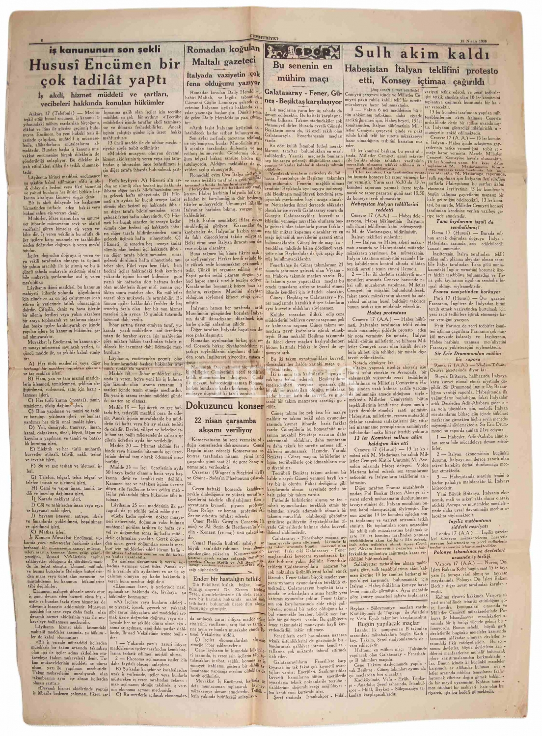 Cumhuriyet, 18 Nisan 1936, "Notamıza İlk Müsbet Cevablar Geldi" "İtalyanlar Harranı da Aldıklarını Söylüyorlar", bir kenar yırtık, 6 sayfa, 42x60 cm