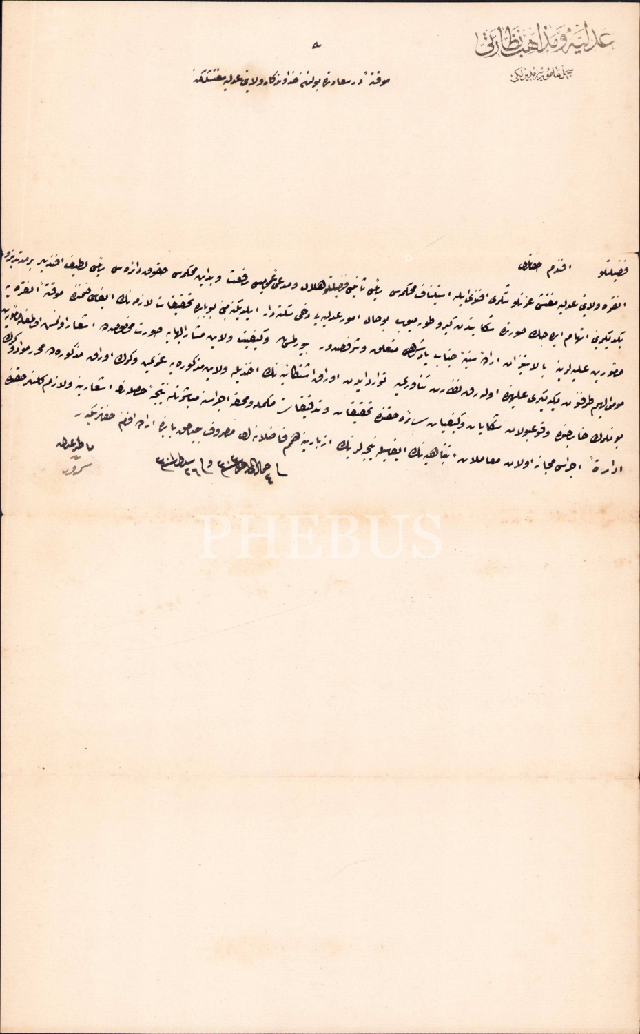 Adliye ve Mezahip Nezareti antetli, Adliye nâzırı Server Paşa ıslak imzalı, Muvakkaten Dersaadet'te bulunan Hüdavendigar Bilayeti adliye müfettişine yazılan, 1303 tarihli Osmanlıca belge, 23x38 cm