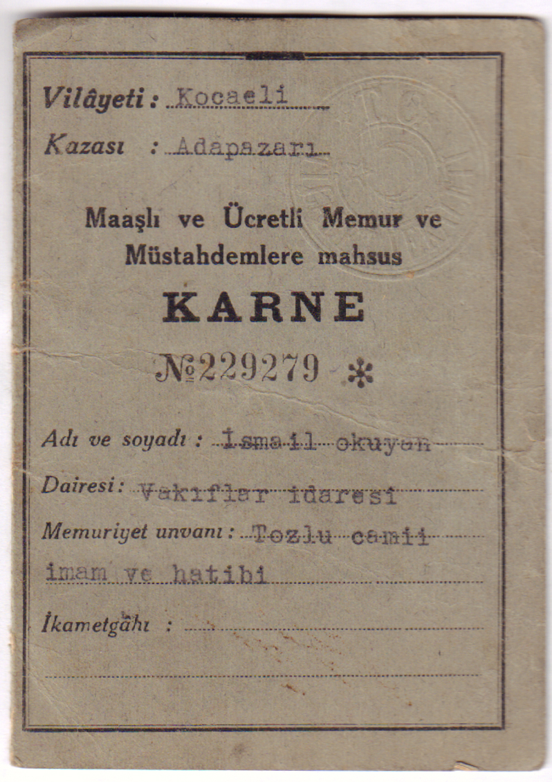 Kimlik- Adapazarı Tozlu Camii İmam ve hatibi İsmail Okuyana mahsus iane Karnesi. Ebat: 9x12 cm.