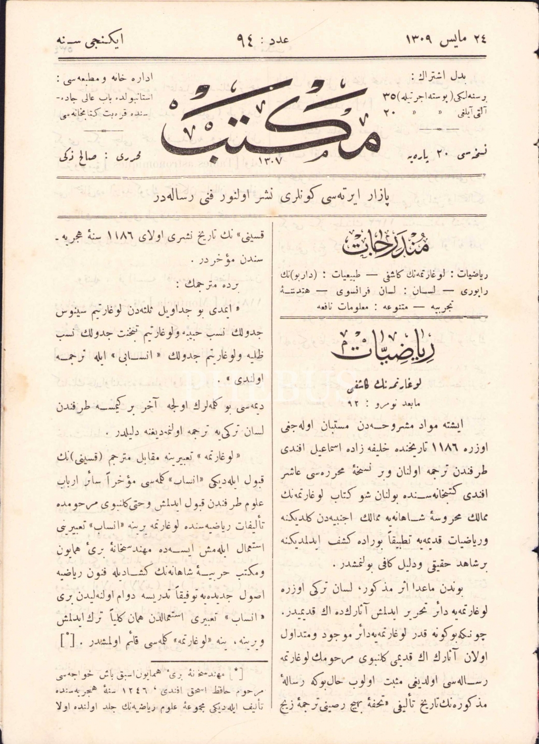 Osmanlıca Mektep risalesi, muharriri Salih Zeki, 24 Mayıs 1309, 12 sayfa, 16x24 cm