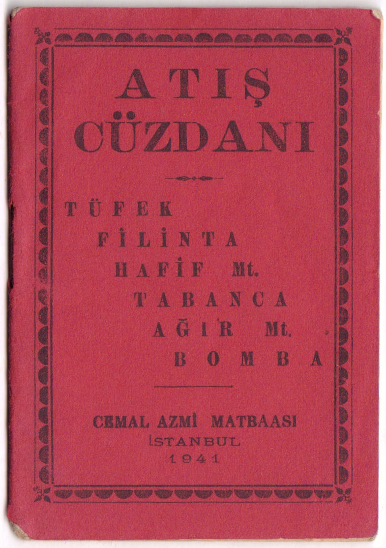 Kimlik- Tüfek, Filinta, Hafif Makinalı, Tabanca, Bomba Atış Cüzdanı. Adapazarı Askerlik Şubesi. Celal Azmi matbaası, İstanbul, 1941. Atatürk ve İstiklal Marşı temalı. Ebat: 8x12 cm.