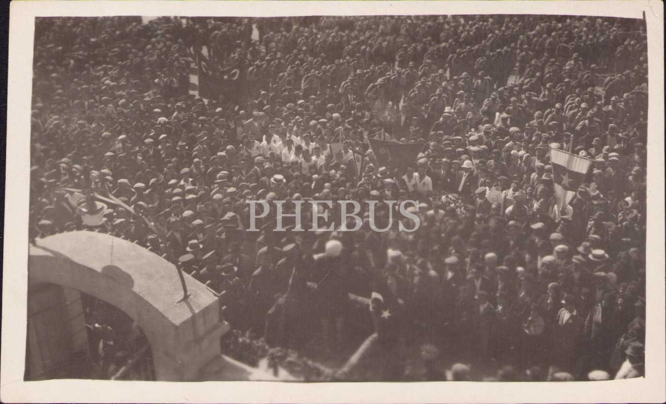 Muhtelif bayraklarla bir araya gelmiş asker ve halk topluluğu, 11x7 cm