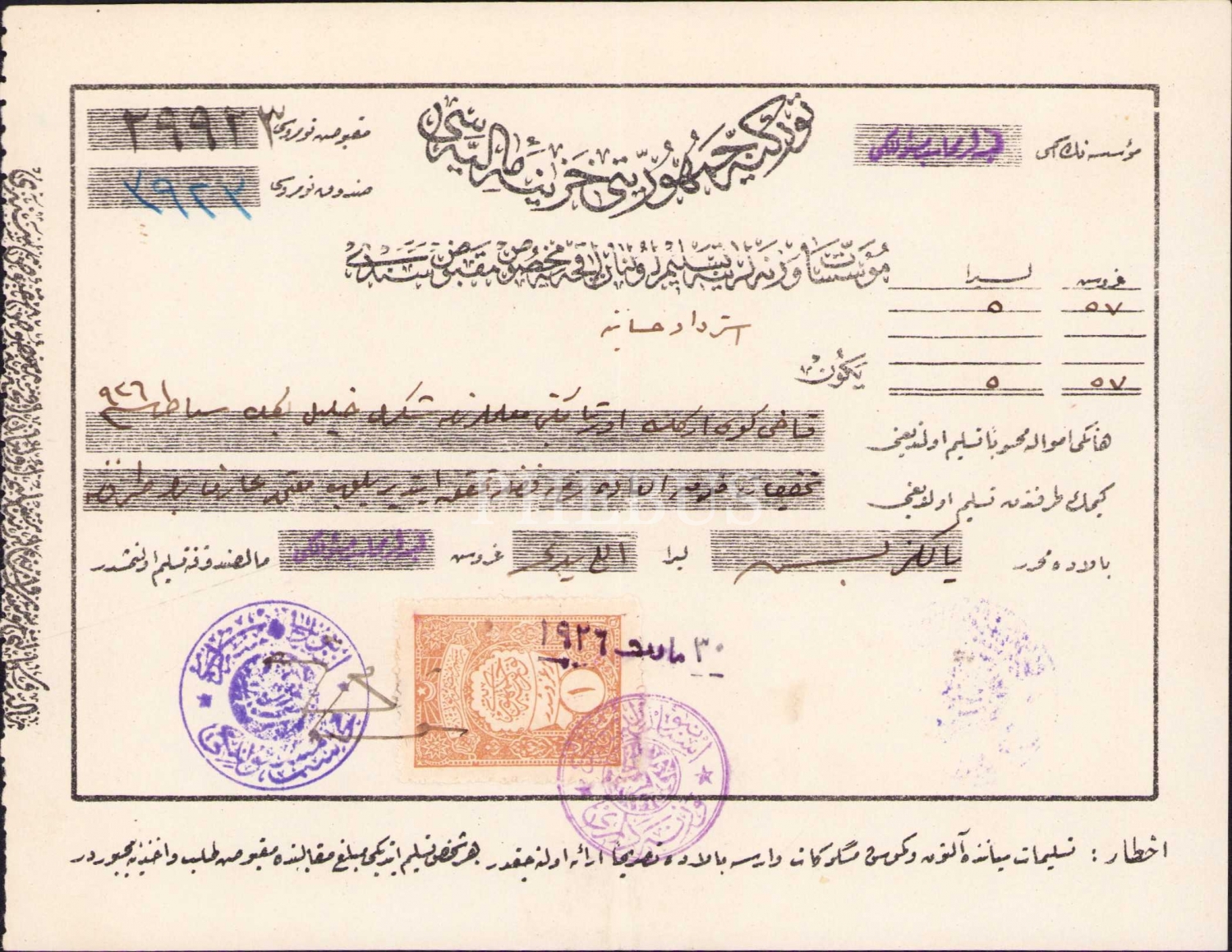 Türkiye Cumhuriyeti Hazine Maliyesi Osmanlıca makbuz senedi, 1926, 16x23 cm