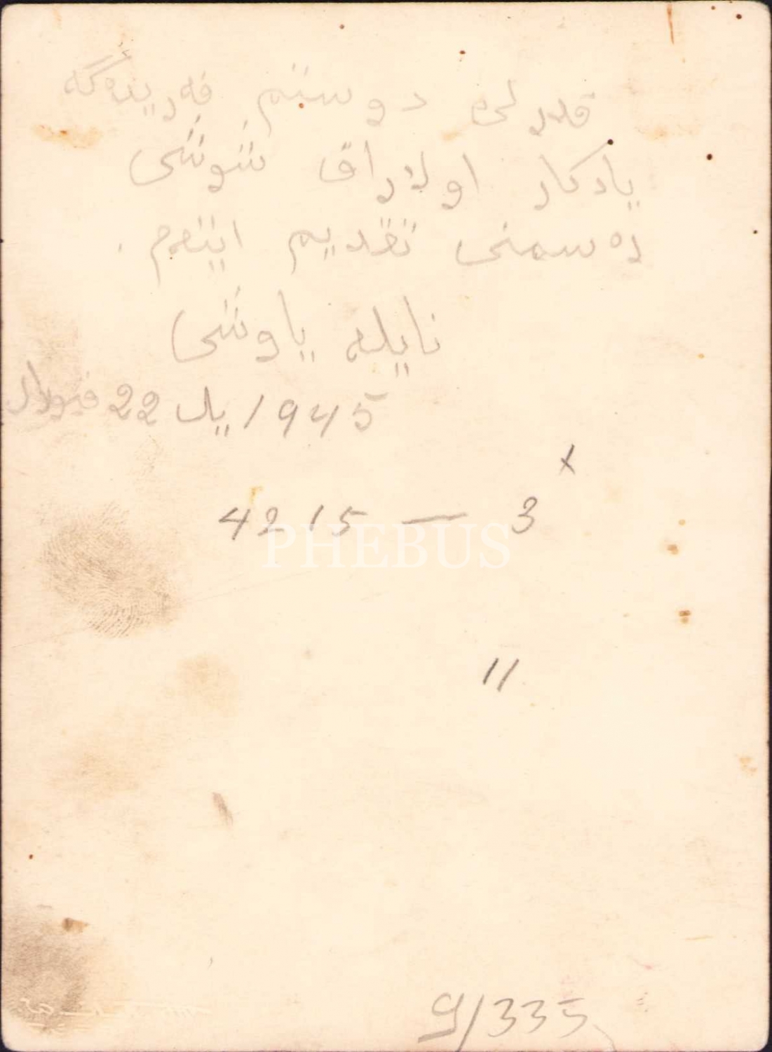 Arkası Osmanlıca ithaflı 1945 tarihli, kız çocuğu stüdyo fotoğraf, Osmanlıca Rumca damgalı, 10x13 cm