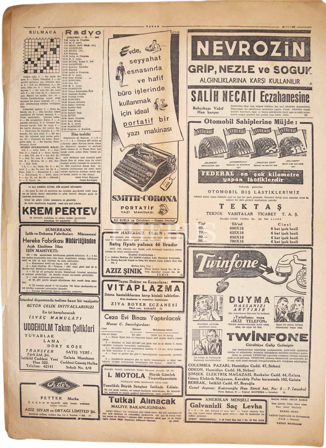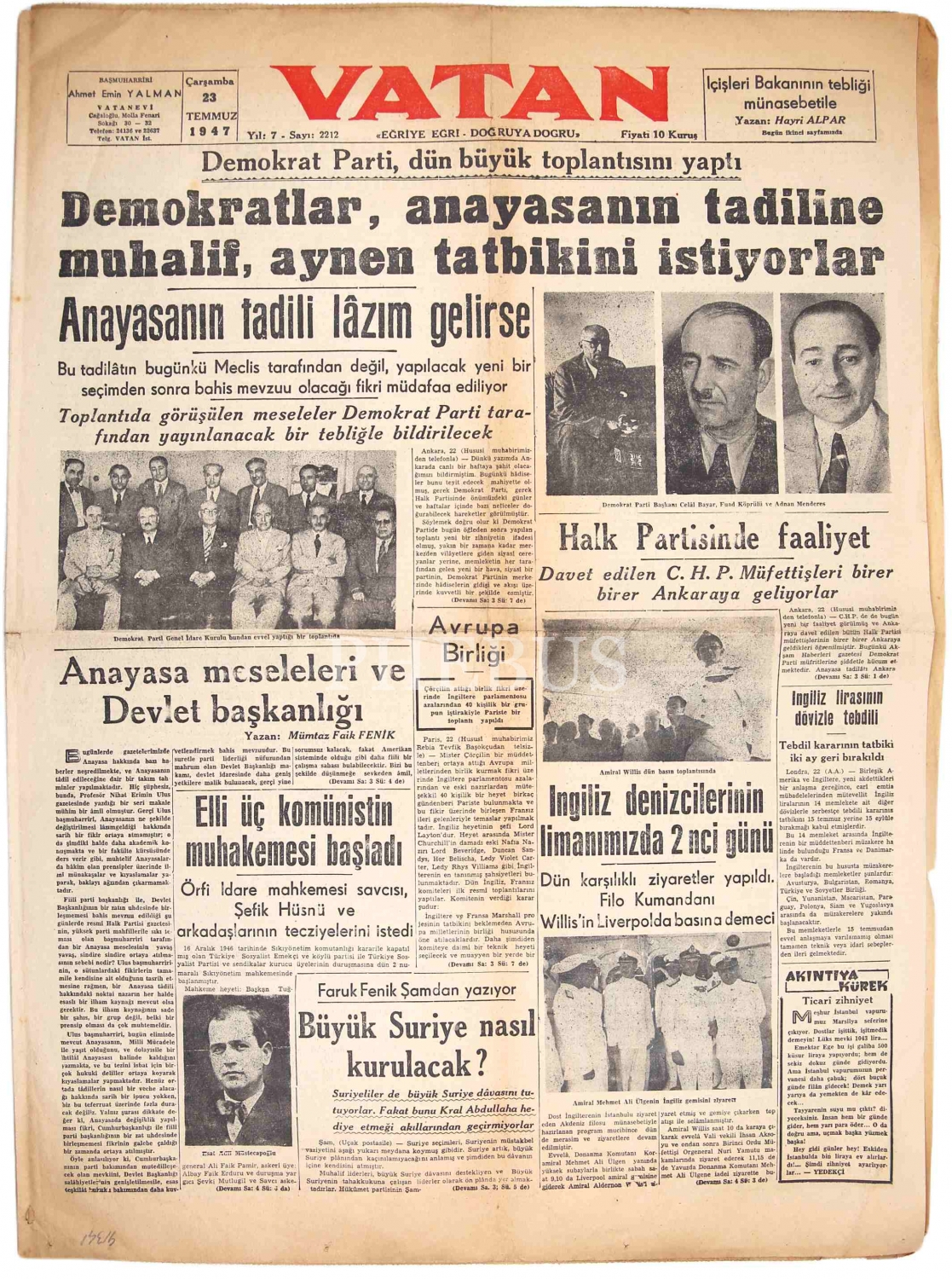 'Demokratlar, Anayasanın Tadiline Muhalif, Aynen Tatbikini İstiyorlar'' manşetli Vatan gazetesi, 23 Temmuz 1947, 6 sayfa, 59x49 cm