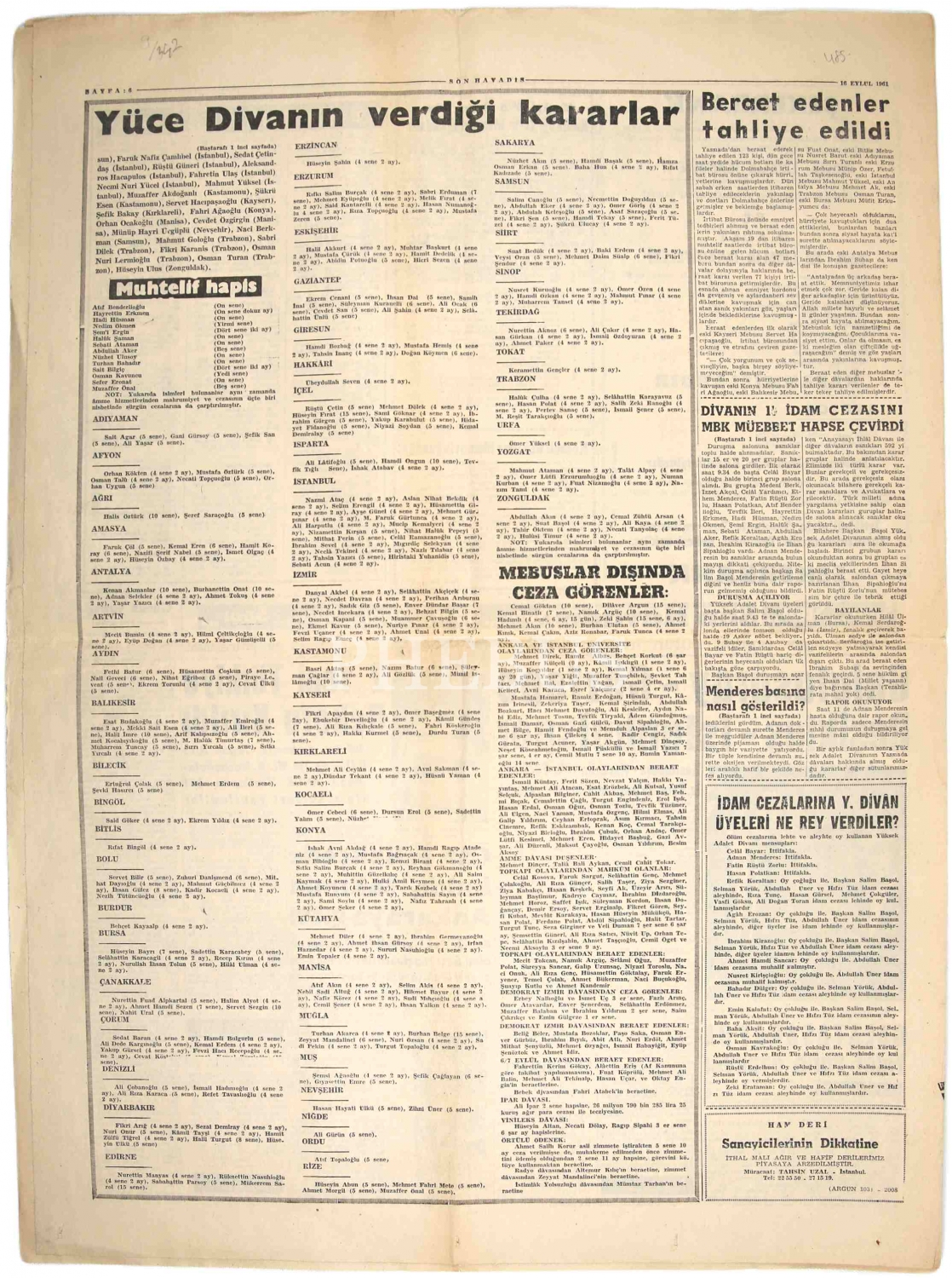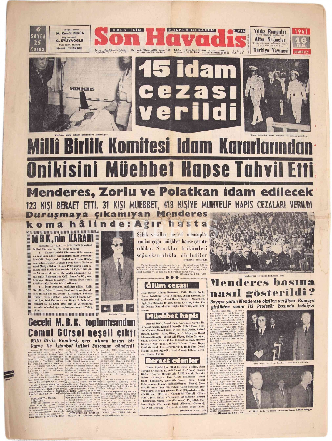 '15 İdam Cezası Verildi - Menderes, Zorlu ve Polatkan İdam Edilecek'' manşetli Son Havadis gazetesi, 16 Eylül 1961, 6 sayfa, 59x43 cm