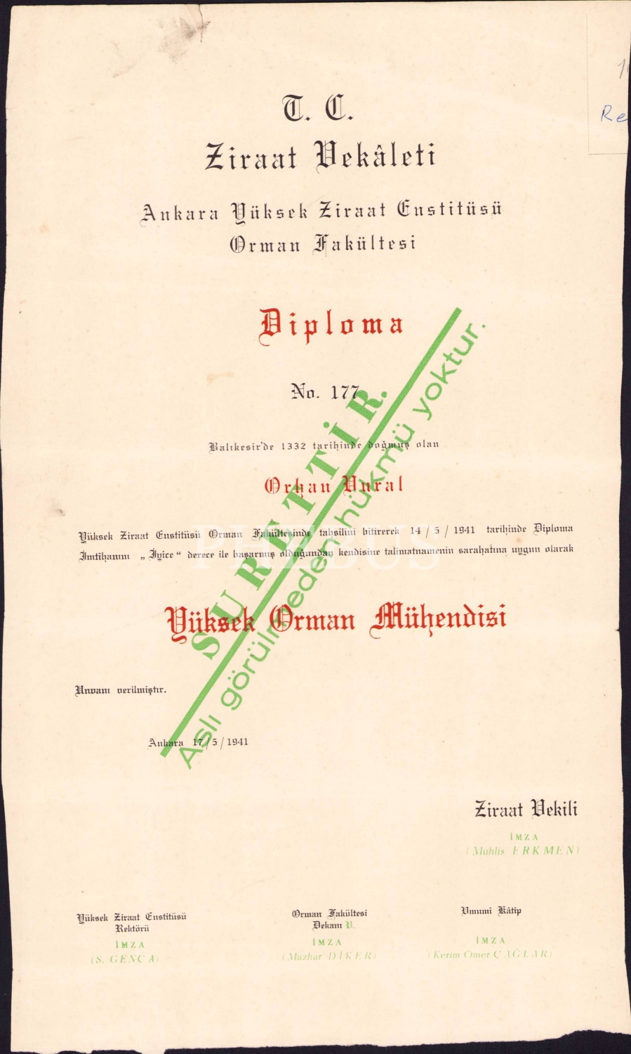 T. C. Ziraat Vekaleti Ankara Yüksek Ziraat Enstitüsü Orman Fakültesi Diploması, 1941 tarihli, 34x20 cm