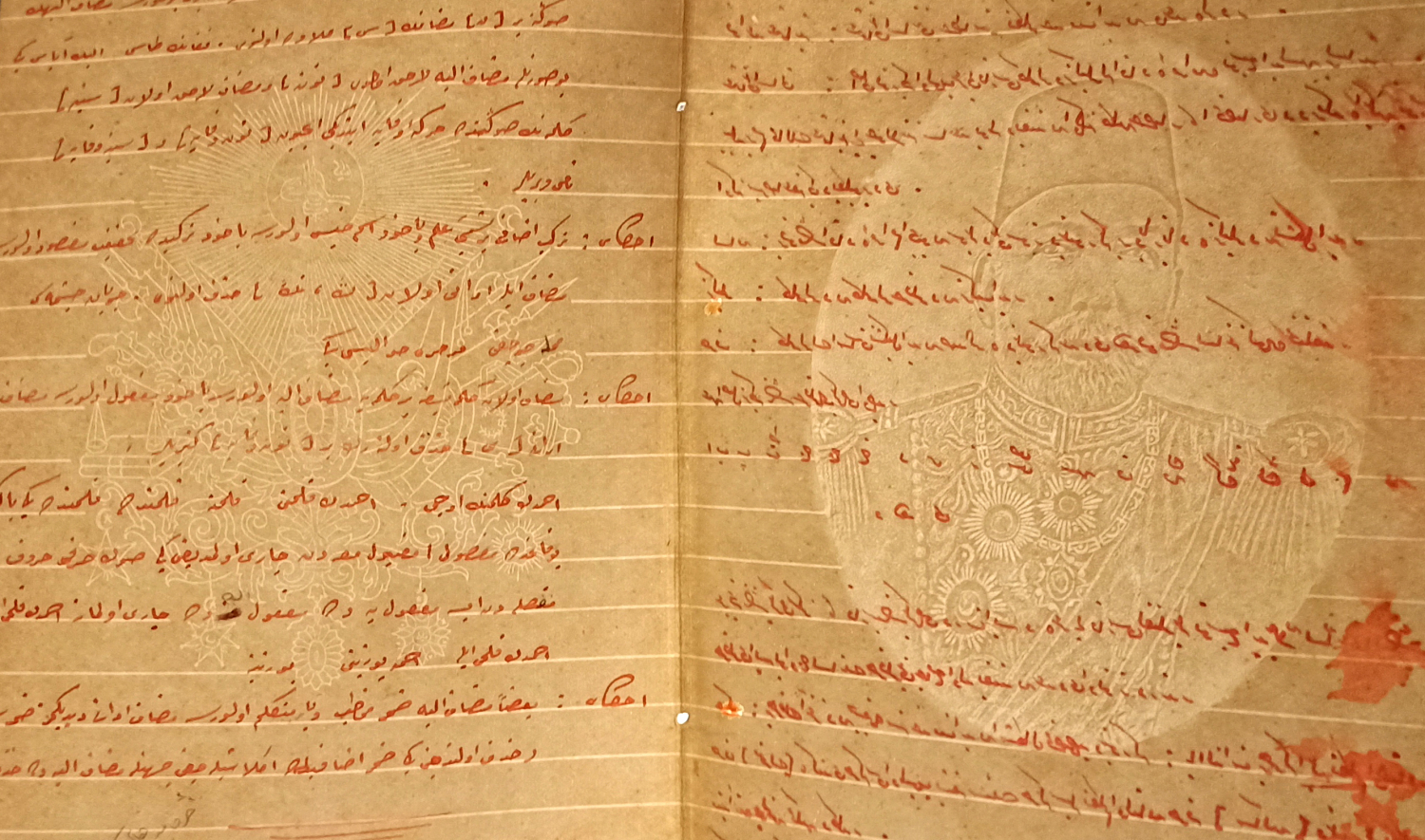 Fligran- Sultan V. Mehmed Reşad portresi ve Osmanlı Devlet Arması fligranlı, üzeri Osmanlıca yazılı iki yaprak. Ebat: 26x20 cm.
