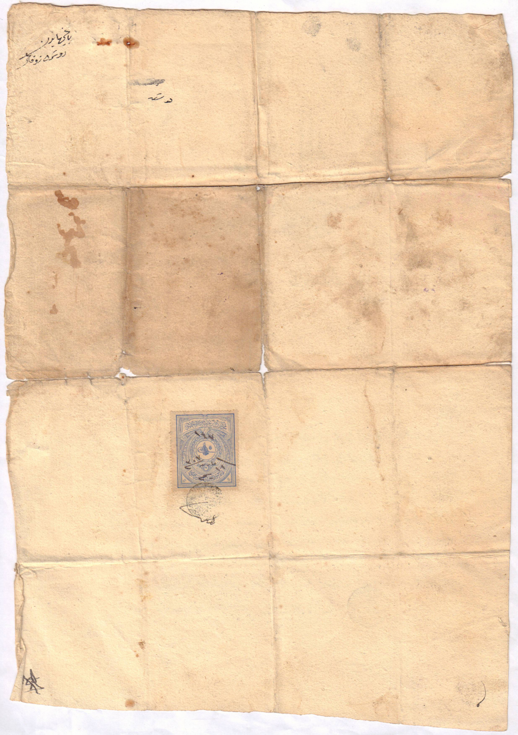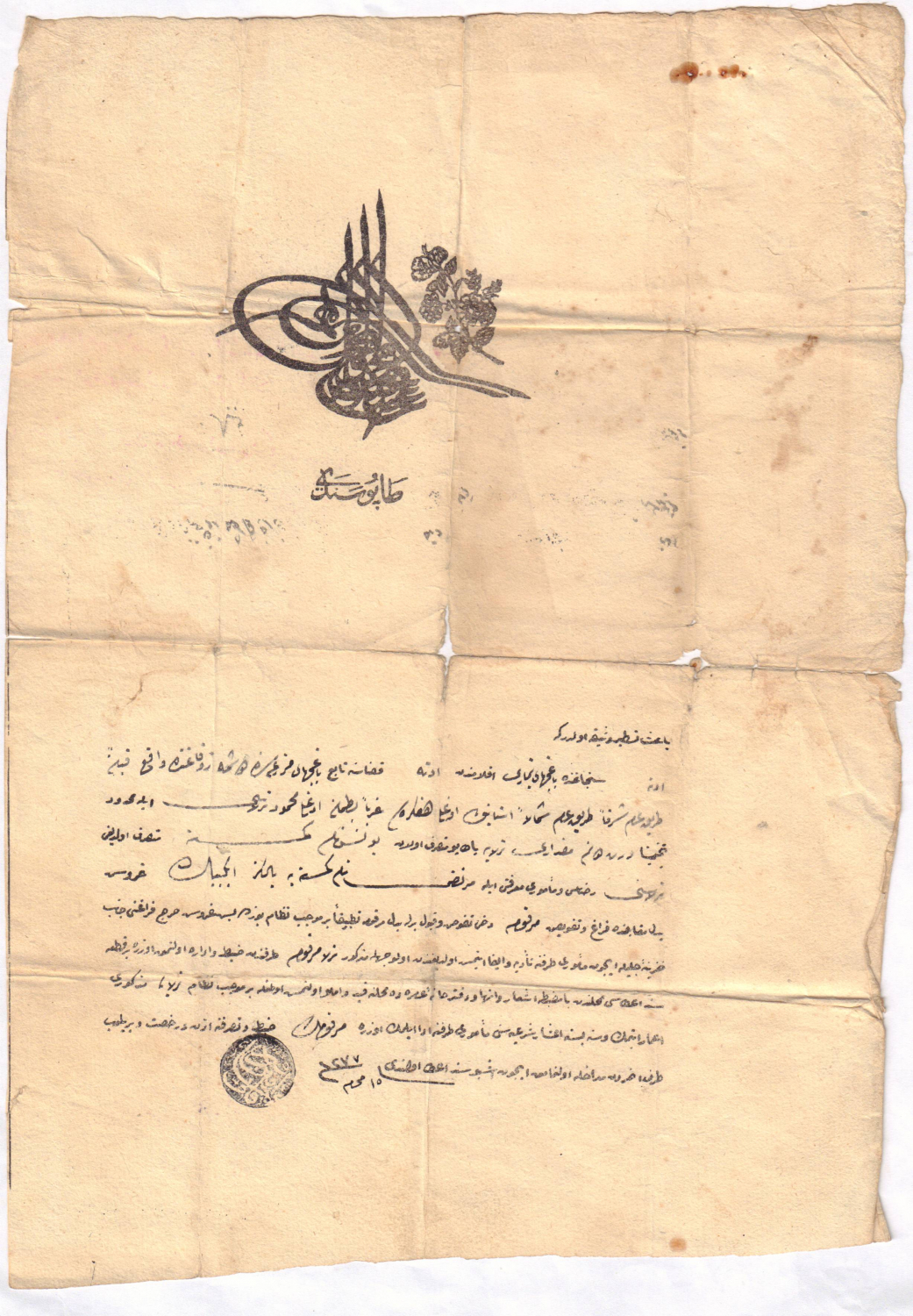Tapu- Adana sancağı, 15 Muharrem 1277 (1860) tarihli tapu senedi. Arkası pullu, mühürlü. Haliyle. Ebat: 27x38 cm.