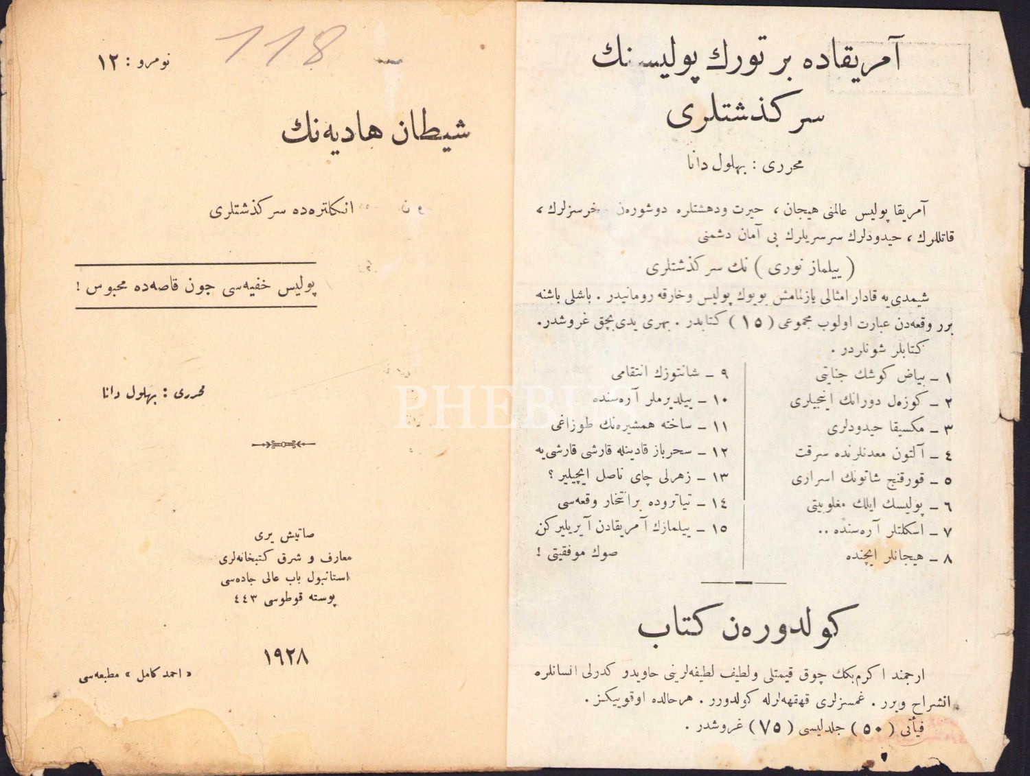 Osmanlıca Şeytan Hadiye [Polisiye İngiltere'de Sergüzeştleri - Polis Hafiyesi Con Kasada Mahbus, Ahmed Kamil Matbaası, 1927, haliyle, 13 sayfa, 13x19 cm