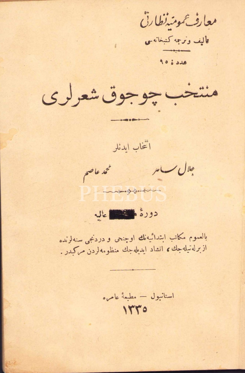 Osmanlıca Müntehib Çocuk Şiirleri Devre-i Ûlâ, Çeviren: Celal Sahir [Erozan] - Mehmed Asım [Us], 1334 Âmire Matbaası, 50 sayfa, 17x12 cm, ÖZEGE; 14843