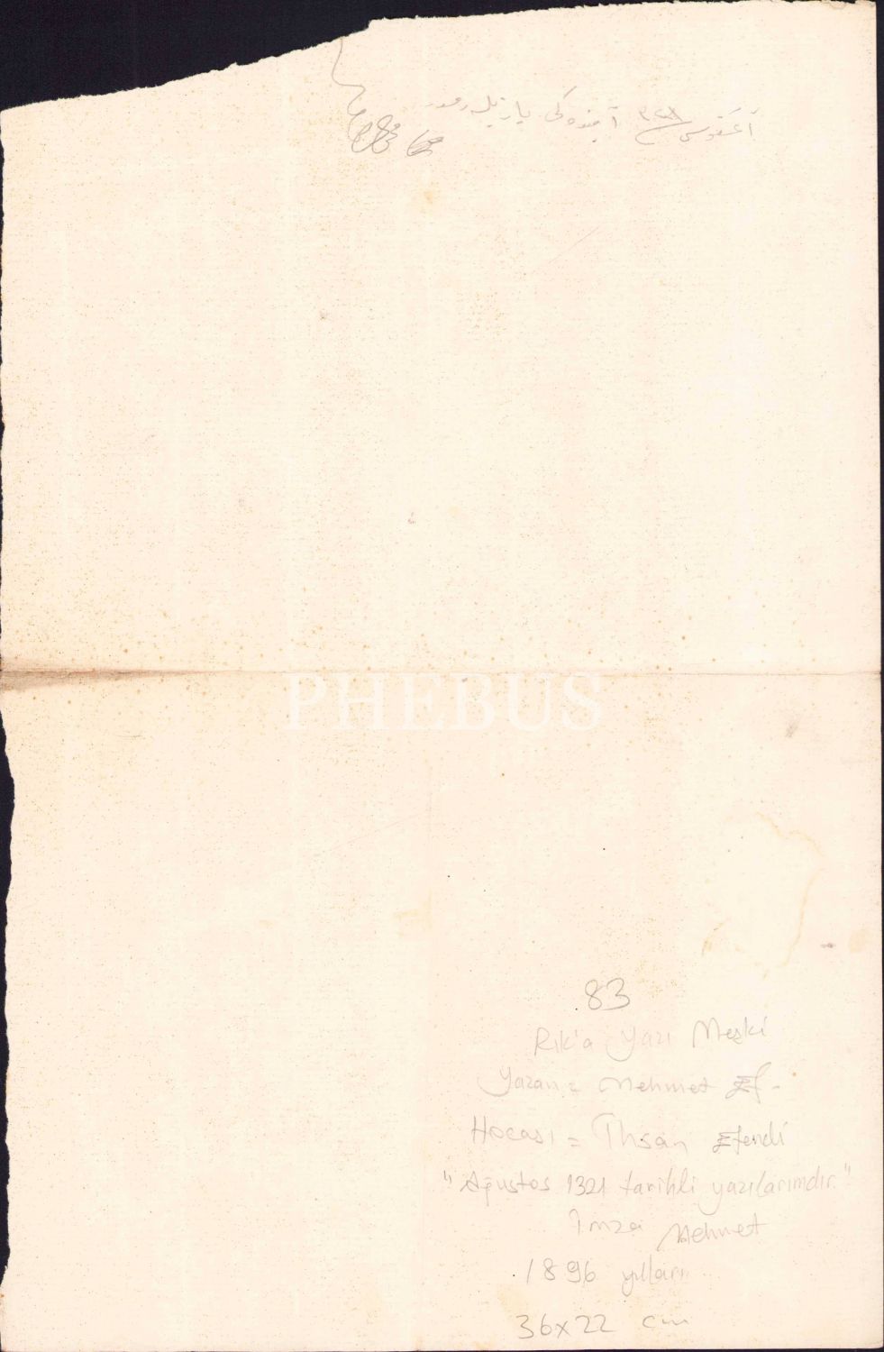 Mehmet Efendi'nin önlü arkalı rik'a meşki, 3 Ağustos 1321, 36x22 cm