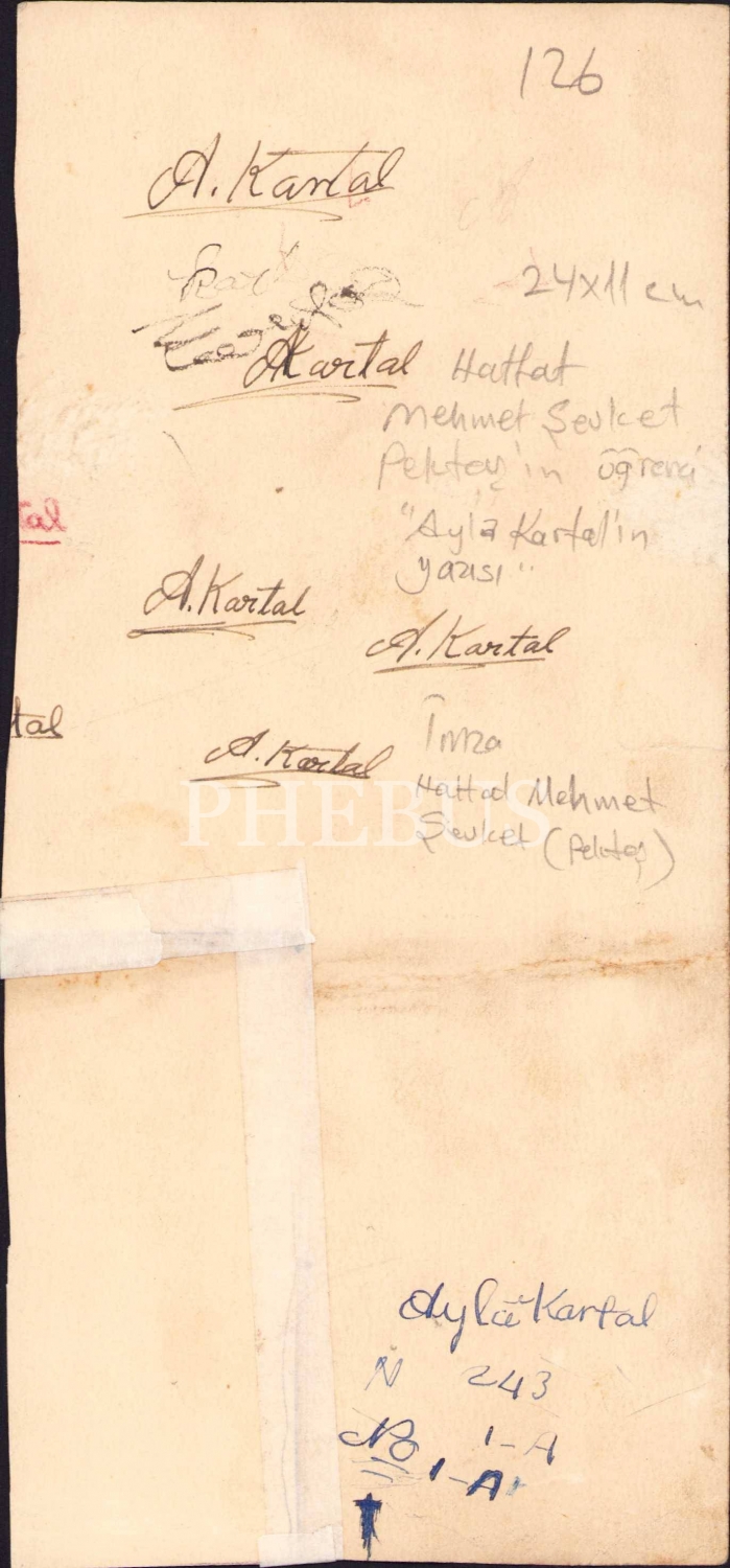 Nesih yazı meşk, Ketebe Ayla [Kartal], 7 Cemaziyel Evvel 1371, Hocasının imzası Hattat Mehmet Şevket [Pektaş], 24x11 cm