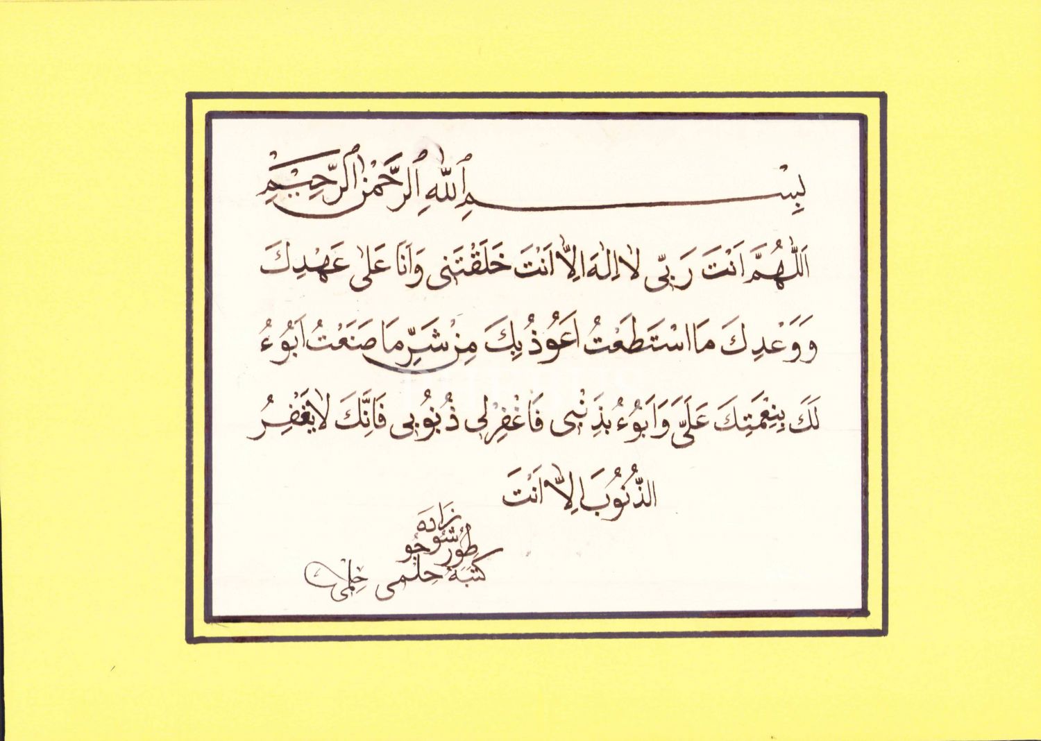 Nesih yazı, "Seyyidül İstiğfar" duası, ketebe Turşucuzade Hilmi [Karasakal], 33x24 cm