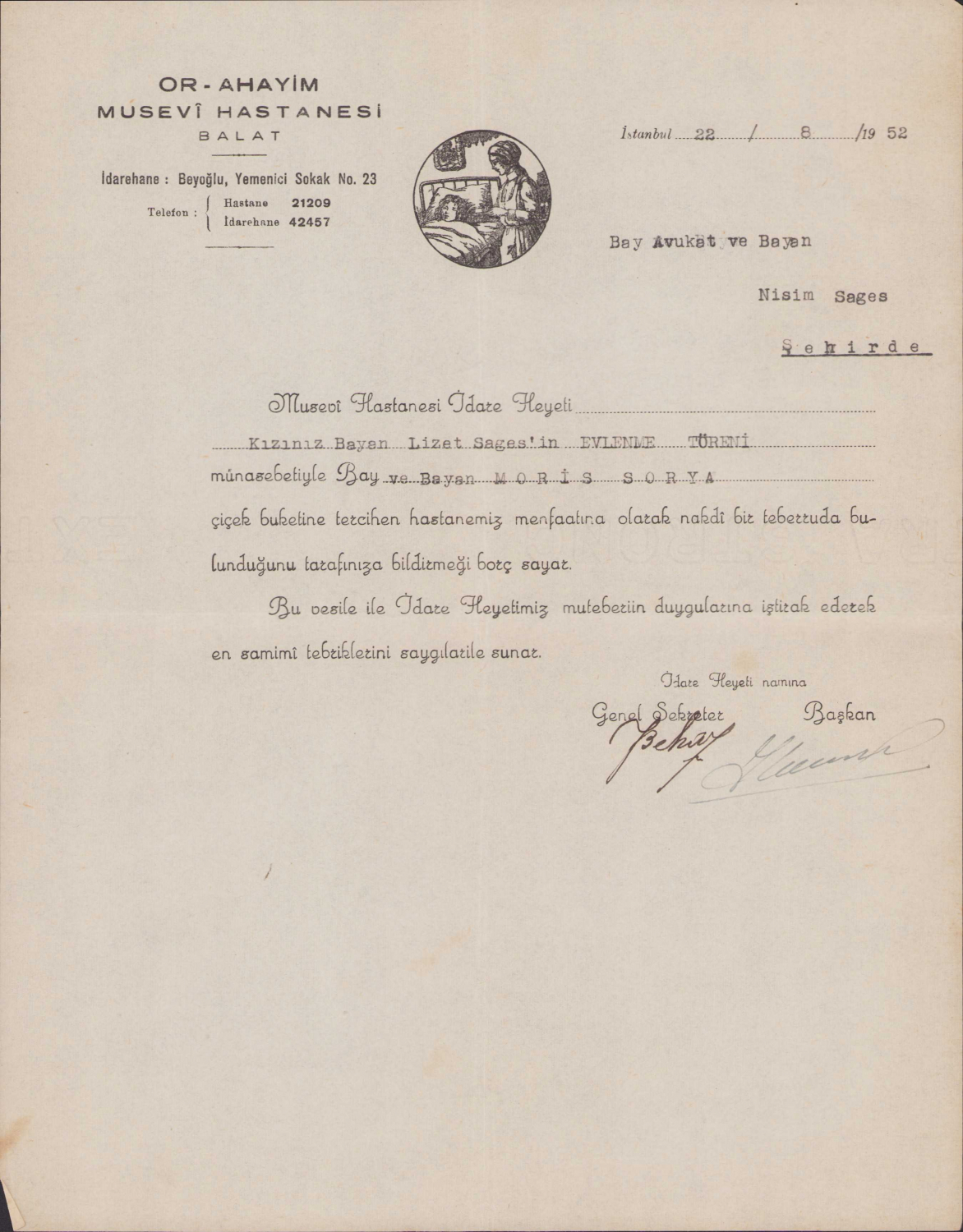 Or-Ahayim Musevi Hastanesi Balat antetli kağıtta düğün tebriği yazısı, 1952 tarihli, 23x29cm