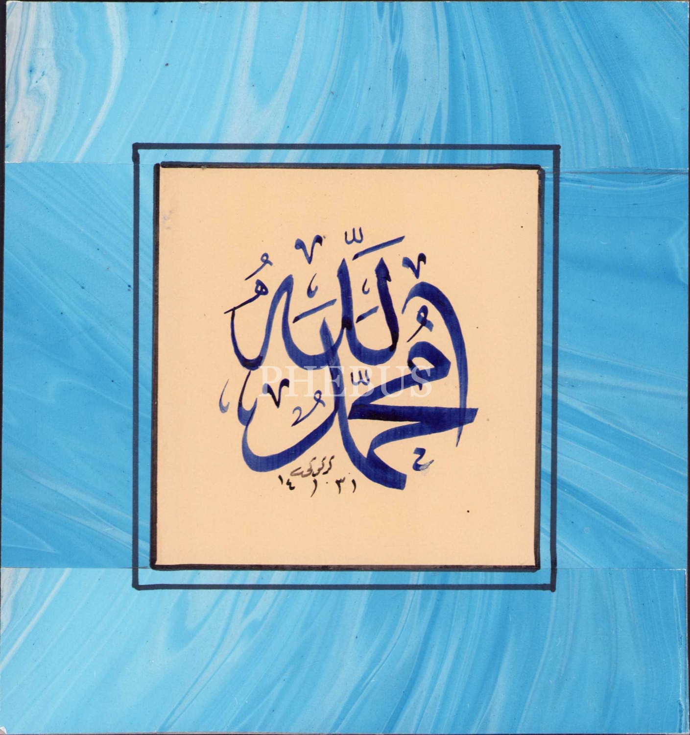 Celi sülüs "Allah C. C. Muhammed Sav", ketebe Kerkuki, Ebru Hikmet Barutçugil, 18x17 cm