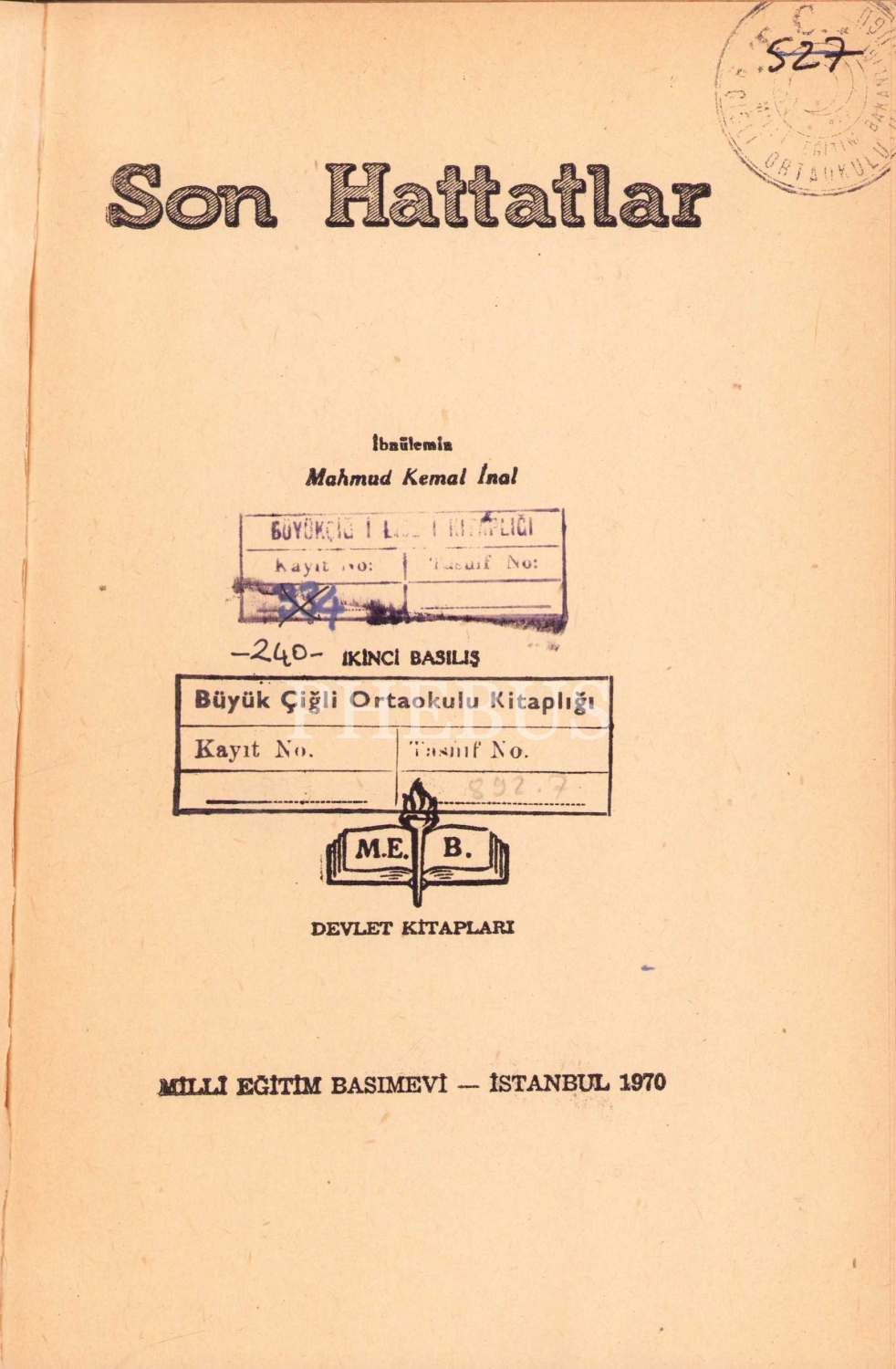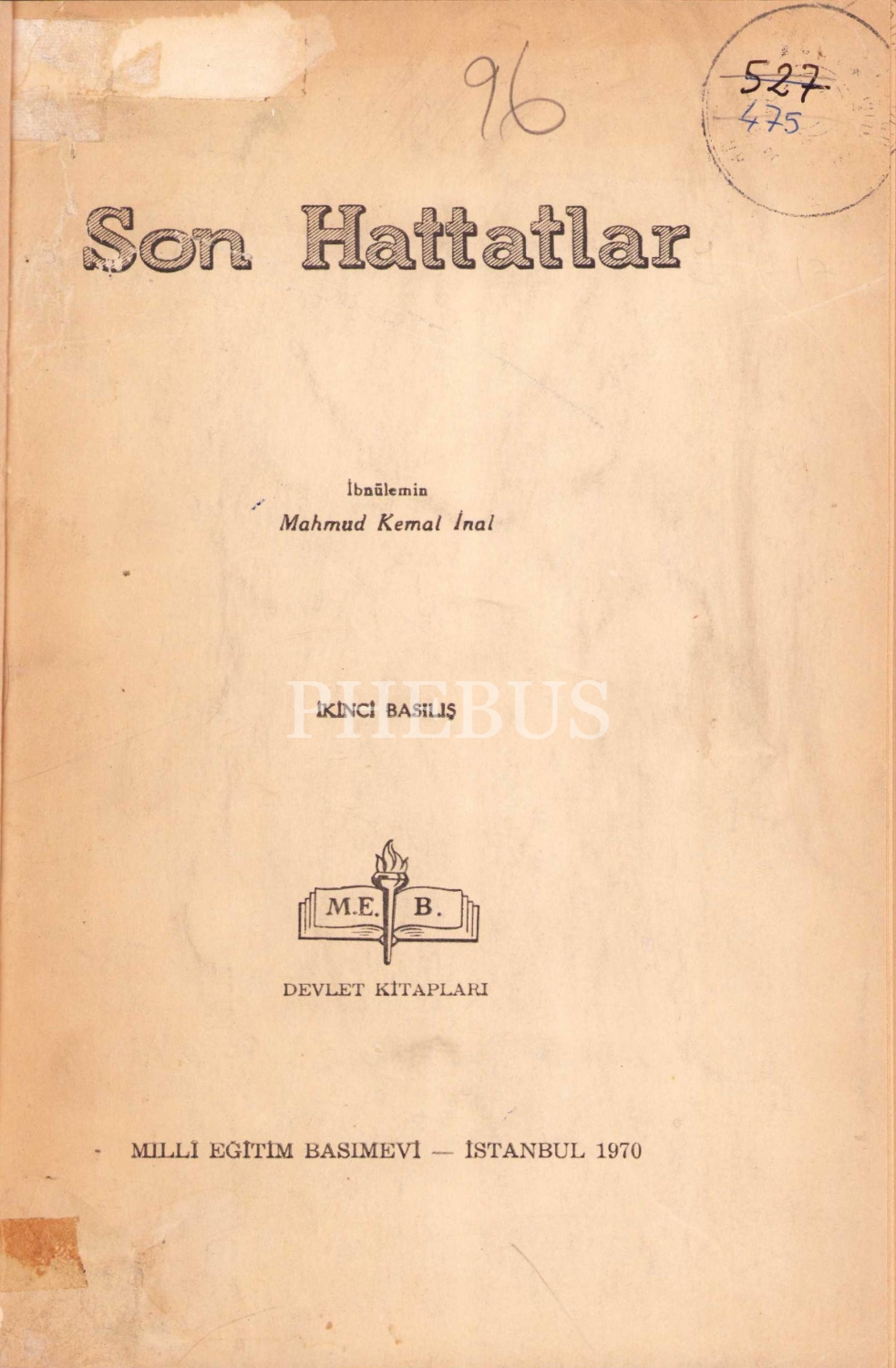 Son Hattatlar, İbnül Emin Mahmut Kemal İnal, 2. Basılış, MEB Devlet Kitapları, Milli Eğitim Basımevi, İstanbul - 1970, 837 sayfa, 23x16 cm
