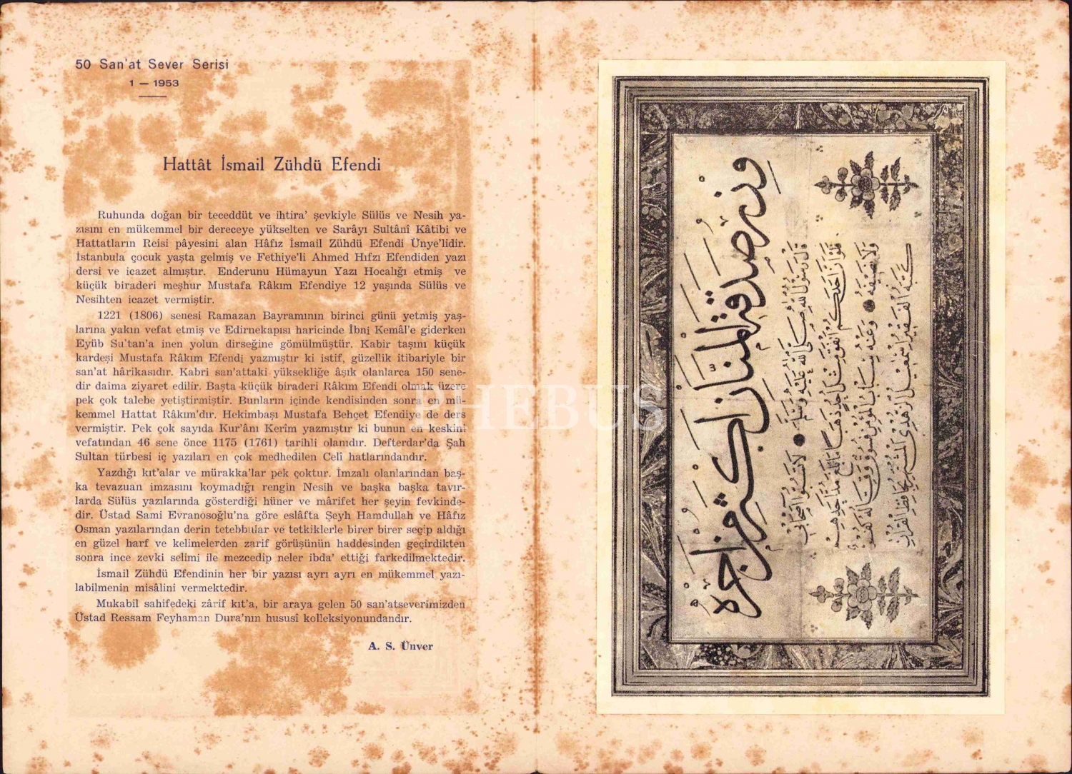 Hattat İsmail Zühdi Efendi, 50 Sanat Sever Serisi No: 1, 1953, A. Süheyl Ünver, İstanbul Kemal Matbaası, 1 sayfa, 25x17 cm