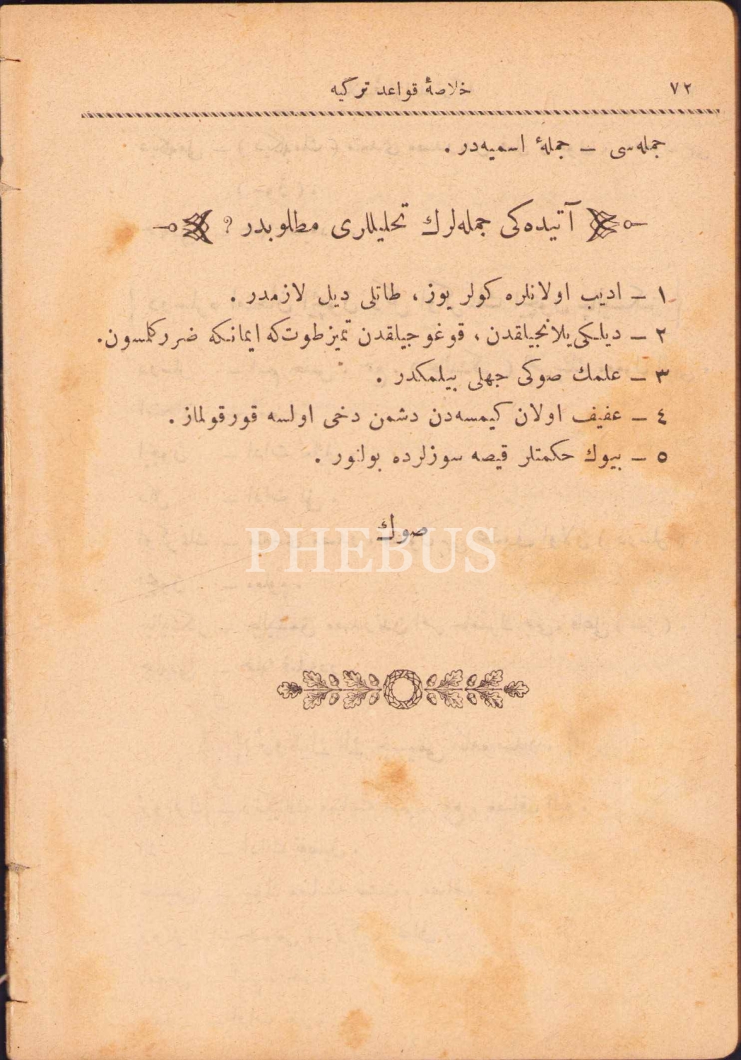 Hulasa-i Kavaidi Türki, Müellifi: Mektebi Bahriye-i Şahane-i İdadi Kavaidi Kitabet ve Kitabeti Osmaniye Muallimi Kolağası Behçet, Bahriye Matbaası, 1319, 72 sayfa, 18x13 cm