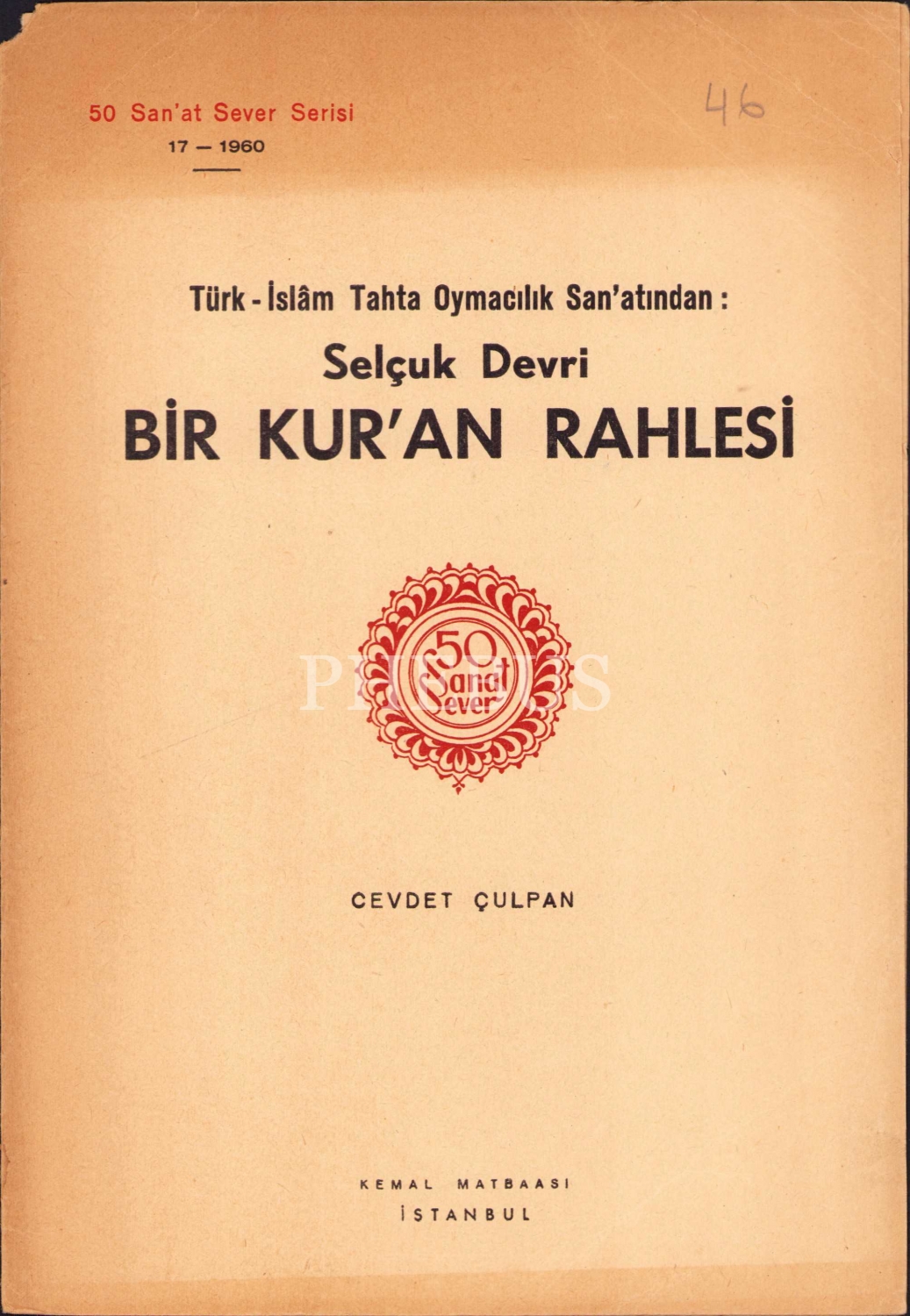 Türk - İslam Tahta Oymacılık Sanatından: Selçuk Devri Bir Kur'an Rahlesi, 50 Sanat Sever Serisi No: 17 - 1960, Cevdet Çulpan, Kemal Matbaası - İstanbul, 4 sayfa, 25x17 cm