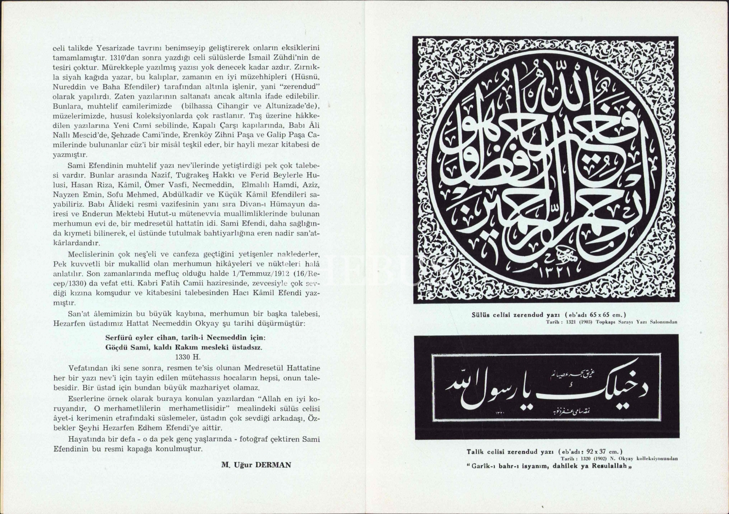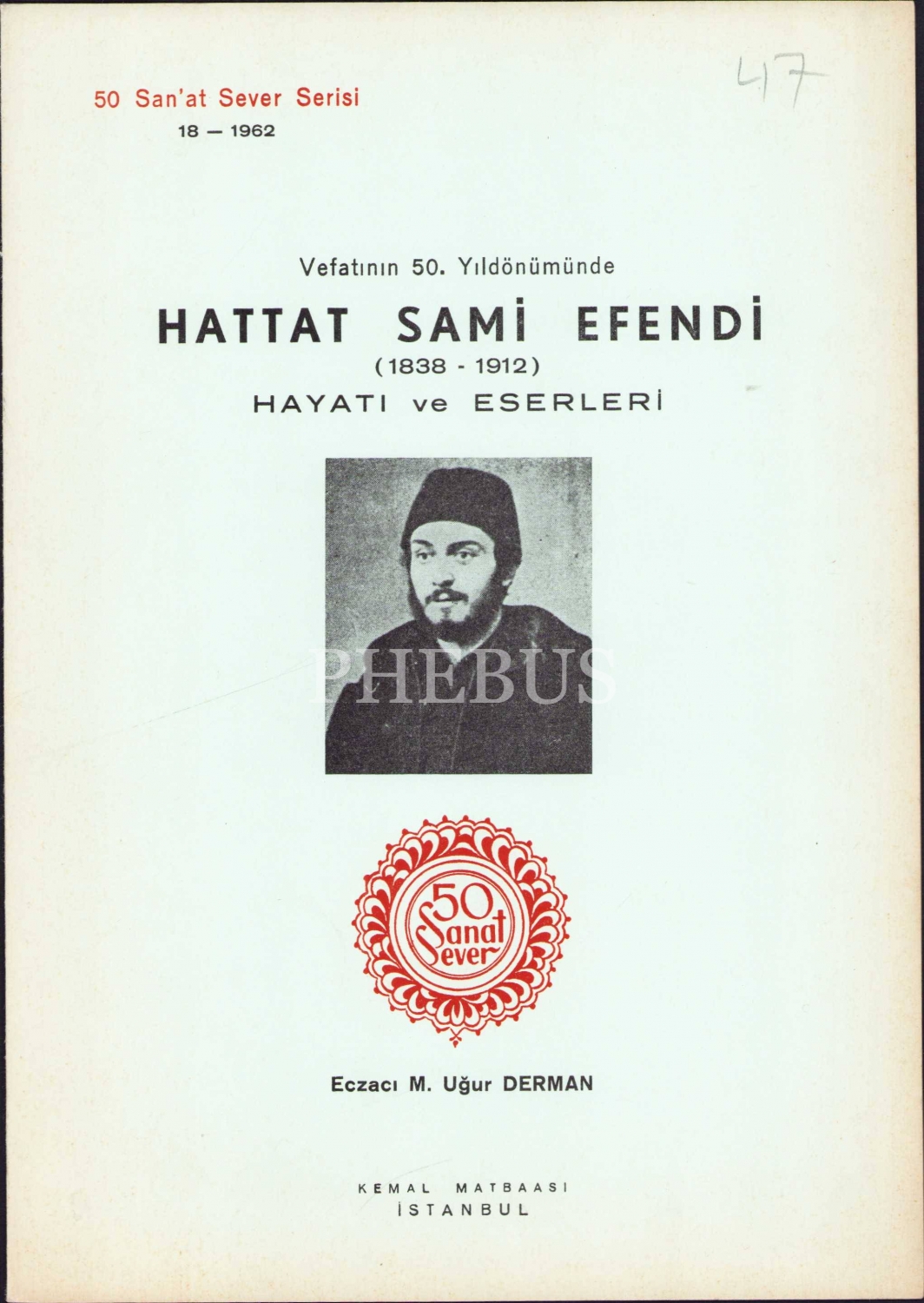 Vefatının 50. Yıldönümünde Hattat Sami Efendi (1838-1912) Hayatı ve Eserleri, 50 Sanat Sever Serisi No: 18 - 1962, Eczacı M. Uğur Derman, Kemal Matbaası - İstanbul, 4 sayfa, 25x17 cm