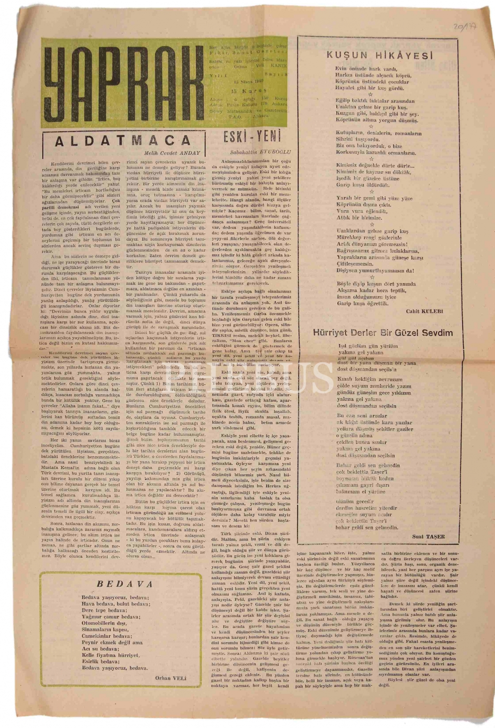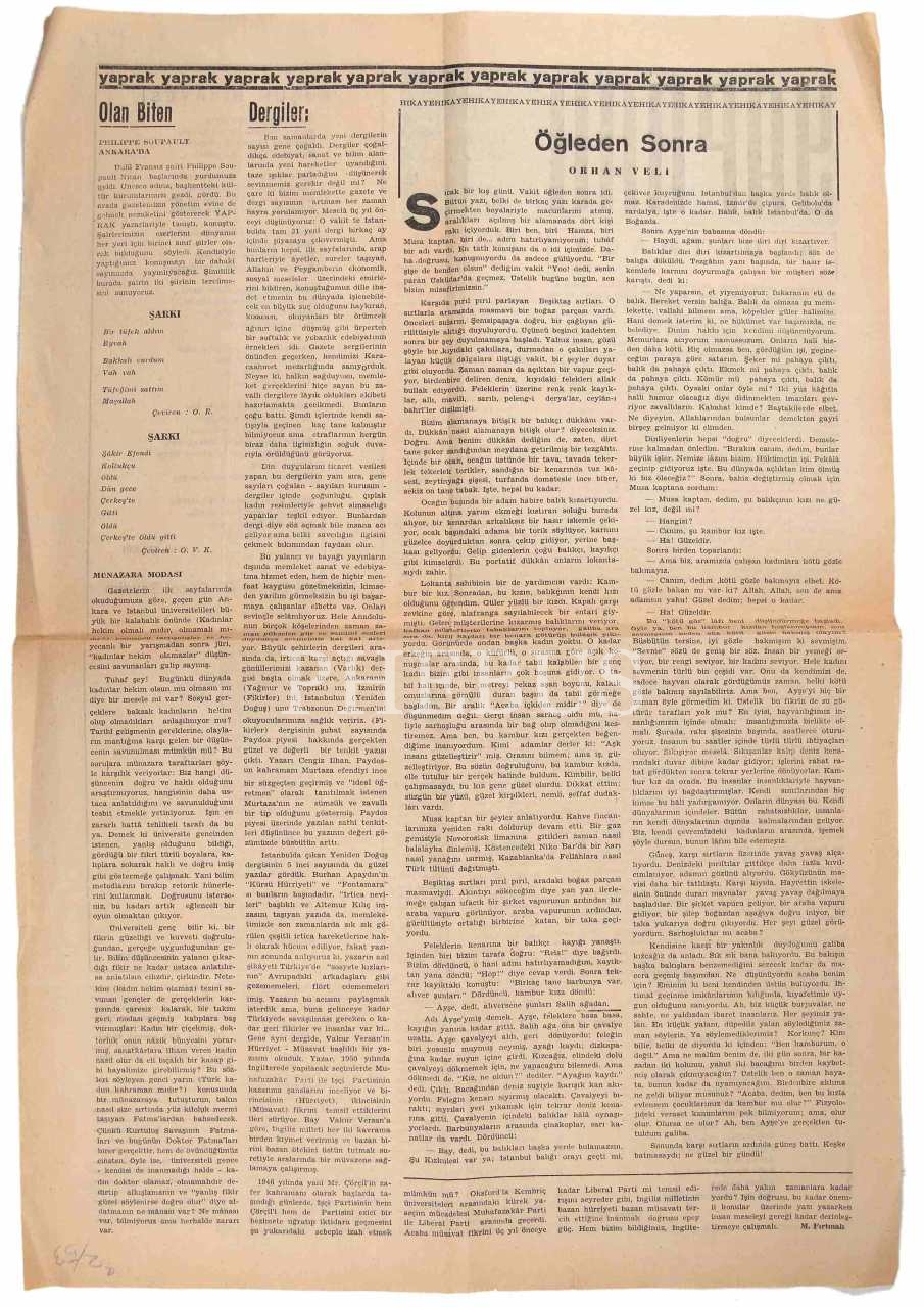 Orhan Veli Kanık'ın yazı işlerini yaptığı Yaprak fikir ve sanat gazetesi, 2 sayfa, 49x32 cm