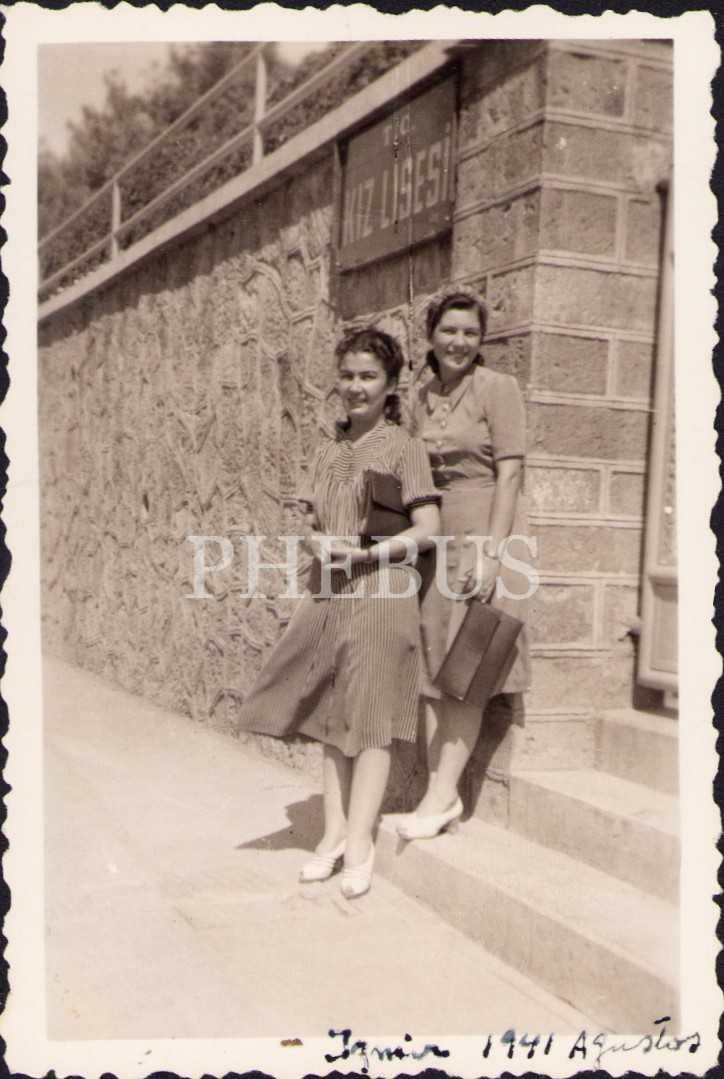 T.C. Kız Lisesi yazılı tabela önünde kadınlar, İzmir 1941 Ağustos, 9x6 cm