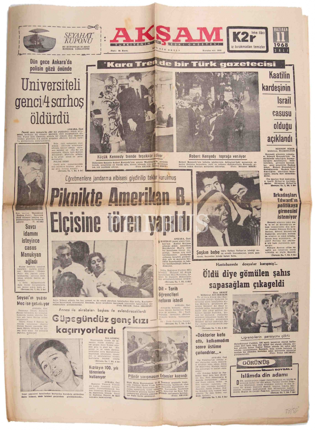 'Piknikte Amerikan Büyükelçisine Tören Yapıldı'' manşetli Akşam gazetesi, 11 Haziran 1968, 8 sayfa, 60x42 cm
