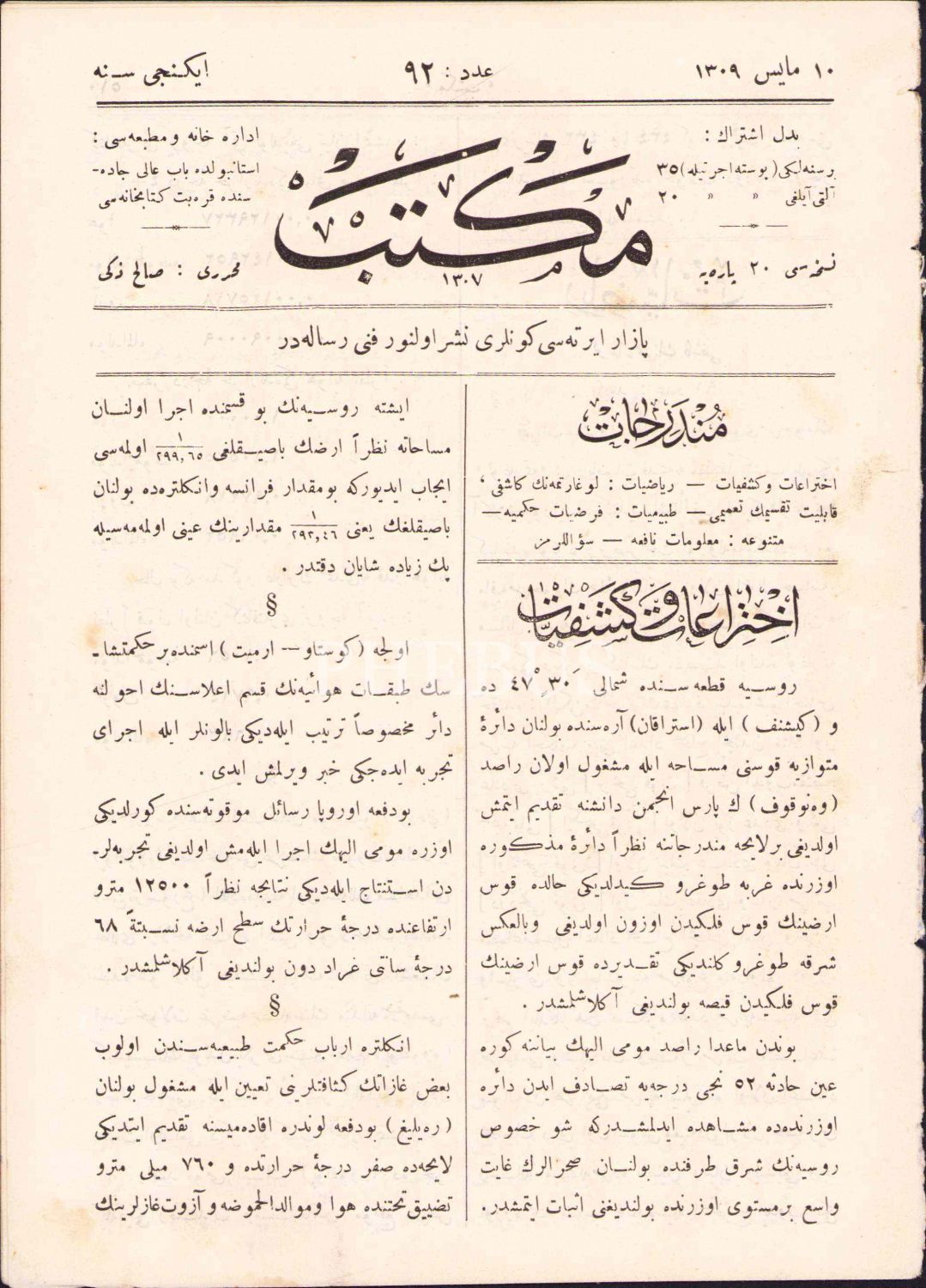 Osmanlıca Mektep risalesi, muharriri Salih Zeki, 10 Mayıs 1309, 12 sayfa, 16x22 cm