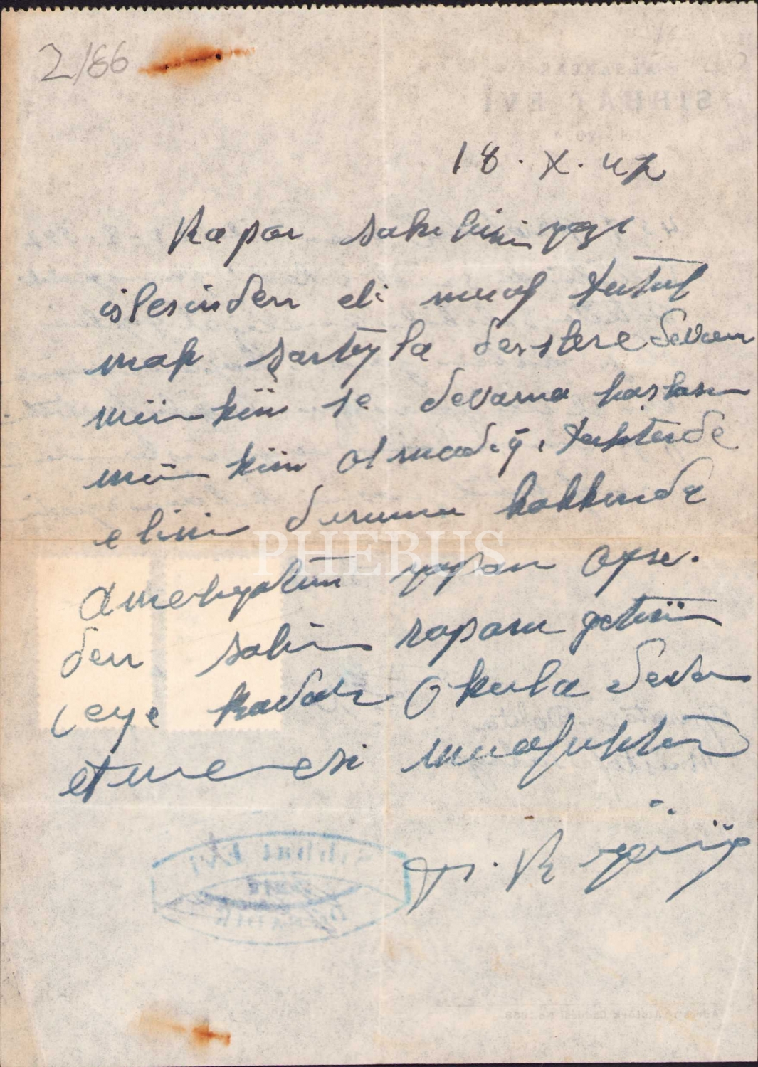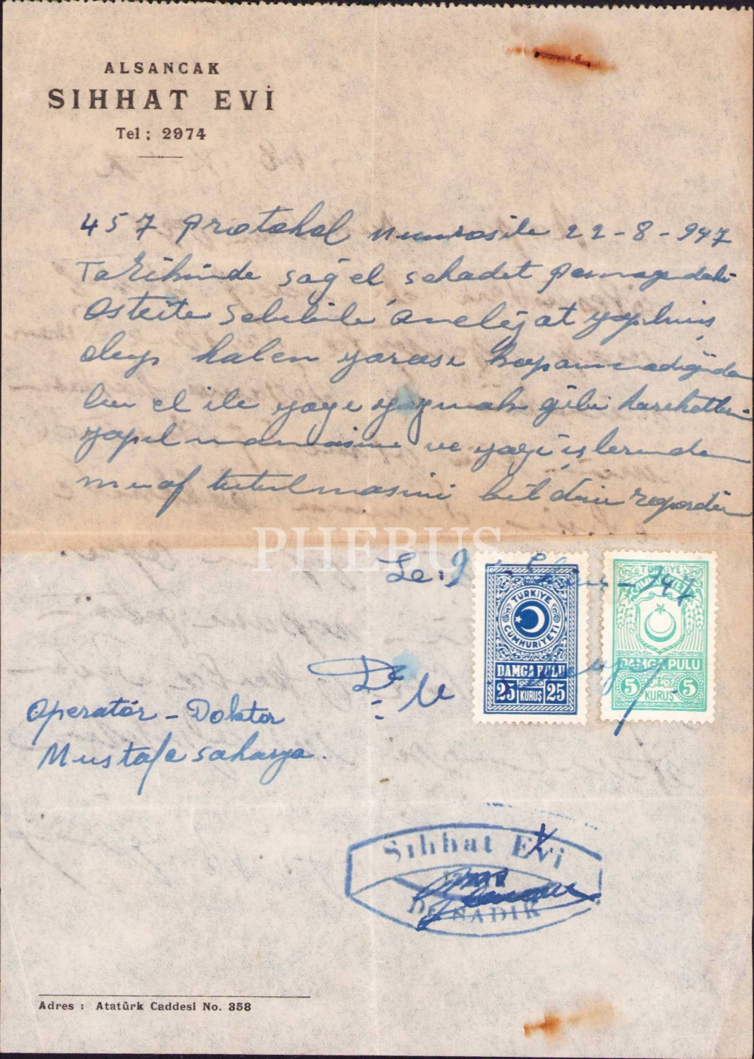 Alsancak Sıhhat Evi antetli, damga pullu yazı, 20x15 cm