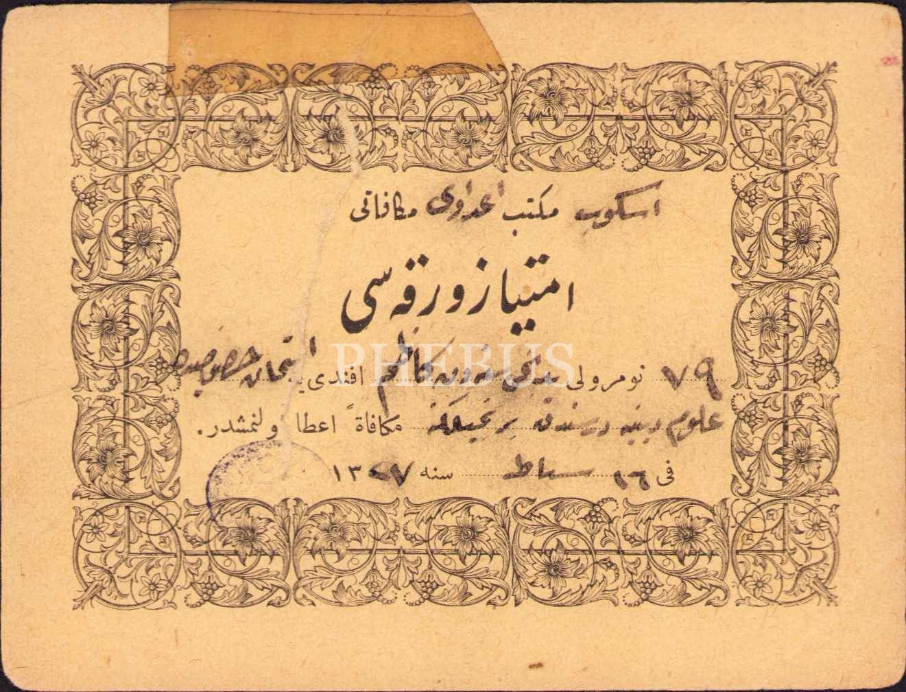 Osmanlıca imtiyaz varakası, Üsküb Mekteb-i İdadi, tamirli, 11x9 cm
