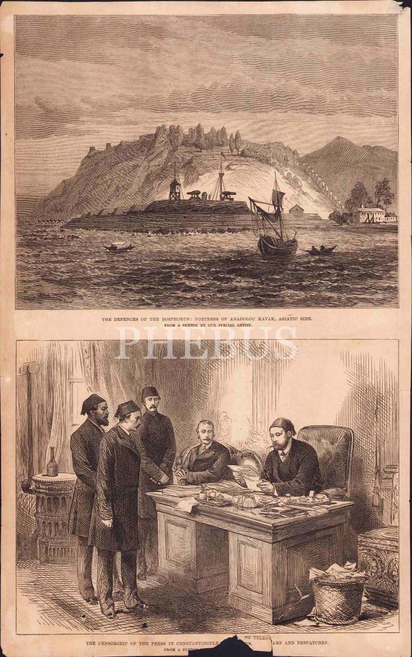 Osmanlı dönemi gravür, "Boğaz [Bosphorus] savunması: Anadolu Kavağı Kalesi, Asya Yakası" konulu, Constantinople, dergiden kesilmiş, bir kenar haliyle, 23x34 cm