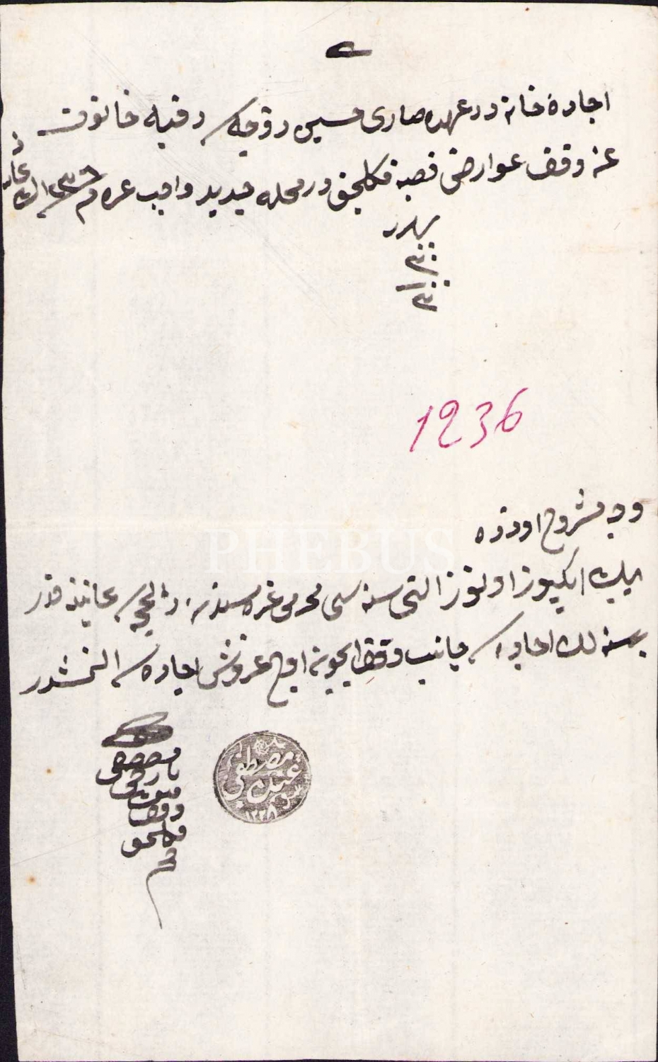 Vakfa ait bir senelik kira bedelinin ödendiğine dair Mustafa mühürlü, 1236 tarihli Osmanlıca senet, 10x15 cm