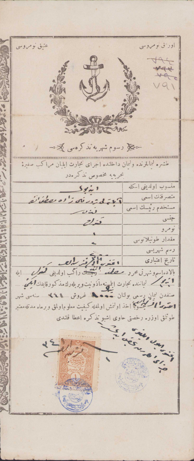 Osmanlı Rüsum-u Şehriye Tezkeresi, denizcilik tarihi, İzmir, 1341 tarihli, 30x12cm