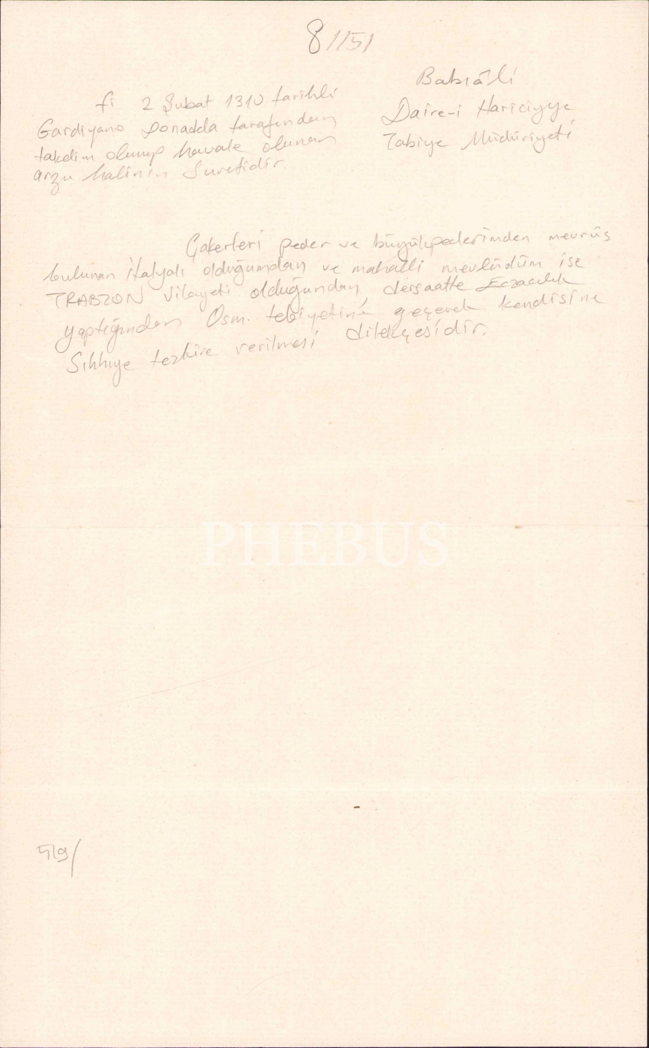 2 Şubat 1310 tarihli Gardiyano Ponedela tarafından takdim olunub havale olunan arzuhalim sureti, 20x30 cm