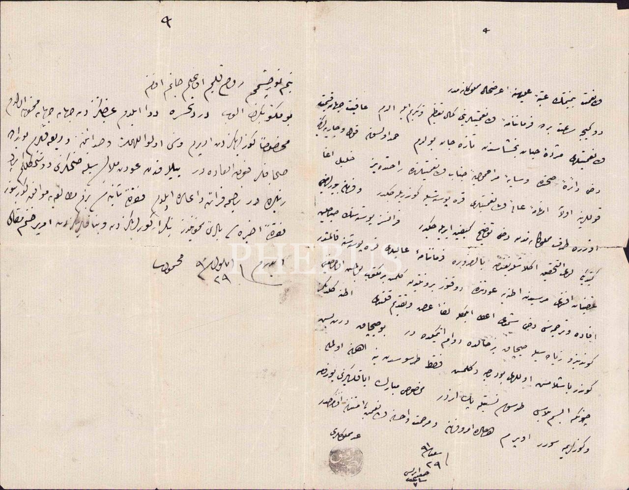 Mahmud Nedim Paşa imzalı Ahmed Refik mühürlü, 1291 tarihli mektup, 12x20 cm