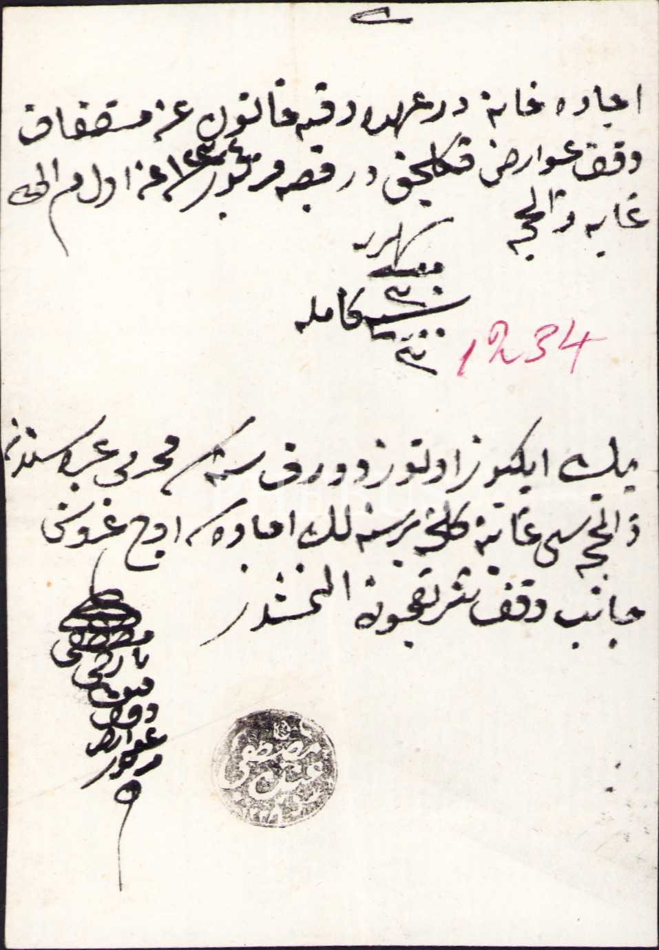 1234 senesine ait vakfa bir senelik kira bedeli ödendiğine dair Osmanlıca senet, 7x10 cm