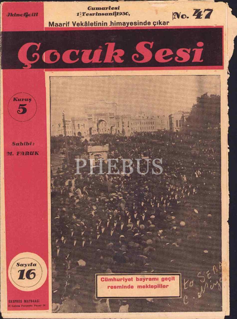 Çocuk Sesi, sahibi M. Faruk, kapak Cumhuriyet Bayramı Geçit Resminde Mektepliler, No. 47, Ekspres Matbaası, haliyle, 16 sayfa, 20x28 cm,
