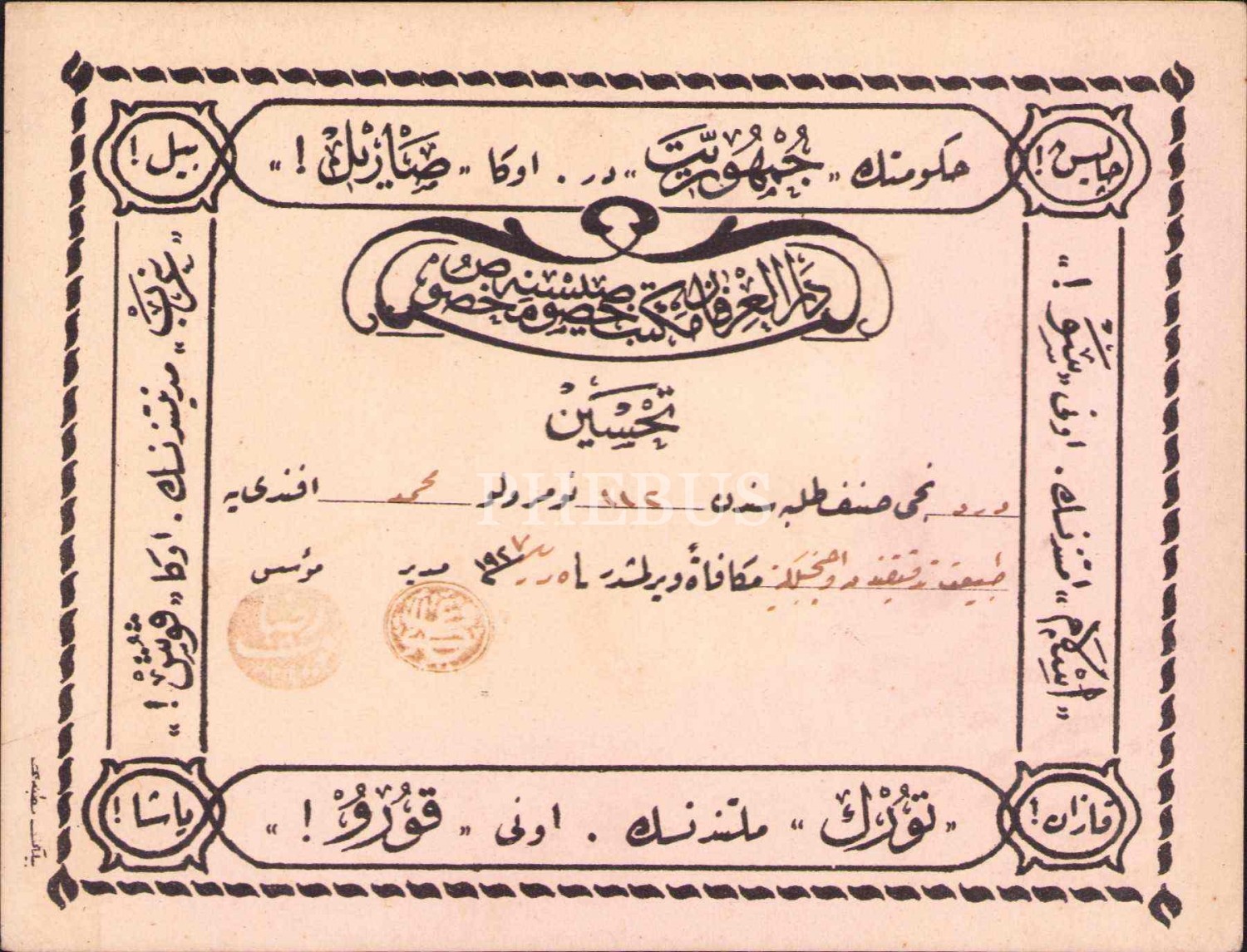 Osmanlıca Tahsin varakası, Darülirfan Mektebi, 1927, 15x10 cm