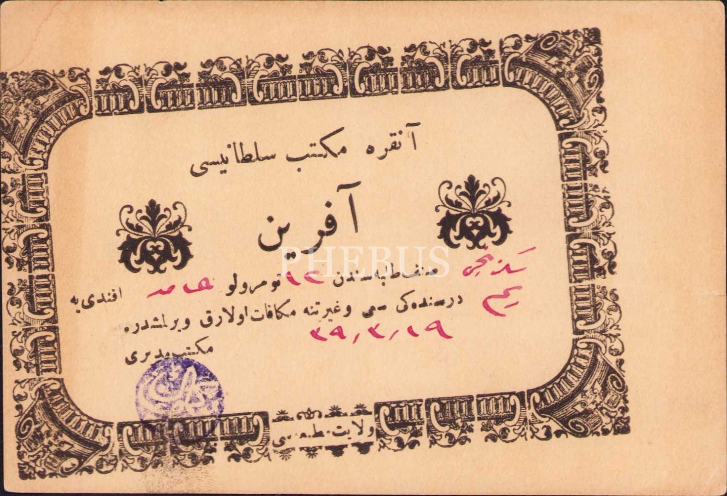 Osmanlıca Aferin, Ankara Mektebi Sultani, 1339, 12x8 cm